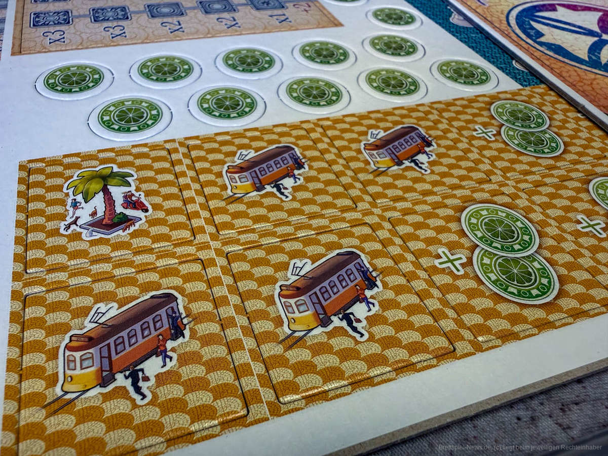 Die grünen Bonus-Marker sind am Ende im Paar jeweils einen Punkt wert. Die Spieler erhalten zu Beginn zwei und können über entsprechende Plättchen weitere dazu verdienen. Neben der Endwertung dienen sie der Manipulation der Auslage und des Spielplans.