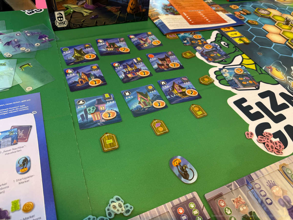 Nachdem das Kostüm angepasst wurde, besteht die Möglichkeit, die Nachbarschaft zu besuchen. Hierbei handelt es sich um eine 3x3 Karten große Auslage “nette Nachbarn” sowie drei weitere Karten mit “fiesen Nachbarn”. Beim Spielaufbau werden jedem Haus Belohnungen zugeordnet und ein Haus ausgelassen, sodass sich Partien unterscheiden.
