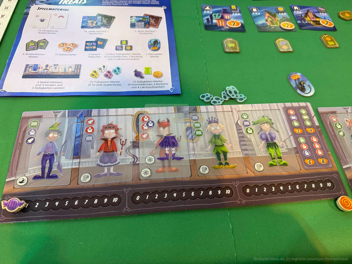 Punkte gibt es für die Zusammensetzung der vollständigen Kostüme, für persönliche Auftragskarte und Auftragskarten der “fiesen Nachbarn”. Bei Gleichstand entscheidet die Menge der gesammelten Süßigkeiten.