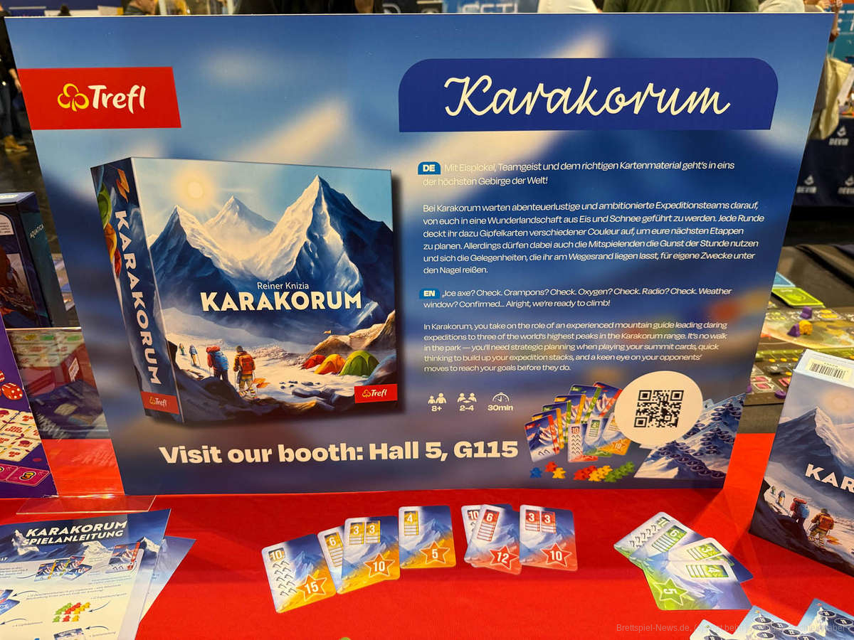 Der polnische Trefl-Verlag veröffentlichte zur SPIEL25 mit “Karakorum” den nächsten Titel des Erfolgsautoren Reiner Knizia, bei dessen über 800 erschienenen Titeln es schwer fällt, zu vermuten, woher man ihn genau kennt. Beispielsweise seien hiermit “My City “ (2020), “MLEM: Space Agency” (2023), ”Rebirth” (2024) und “Purrramid” (2026) genannt.