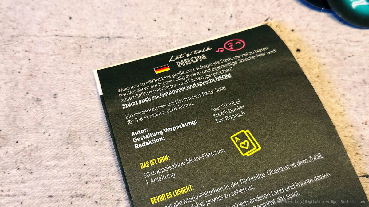 Das ist “Let’s talk NEON”, der jüngste Eintrag von Haba. Das Partyspiel folgt damit der neuen Ausrichtung des Verlags mit mehr Fokus auf Erwachsene. Mit einer Partie sind drei bis acht Spieler etwa 15 Minuten unterhalten.