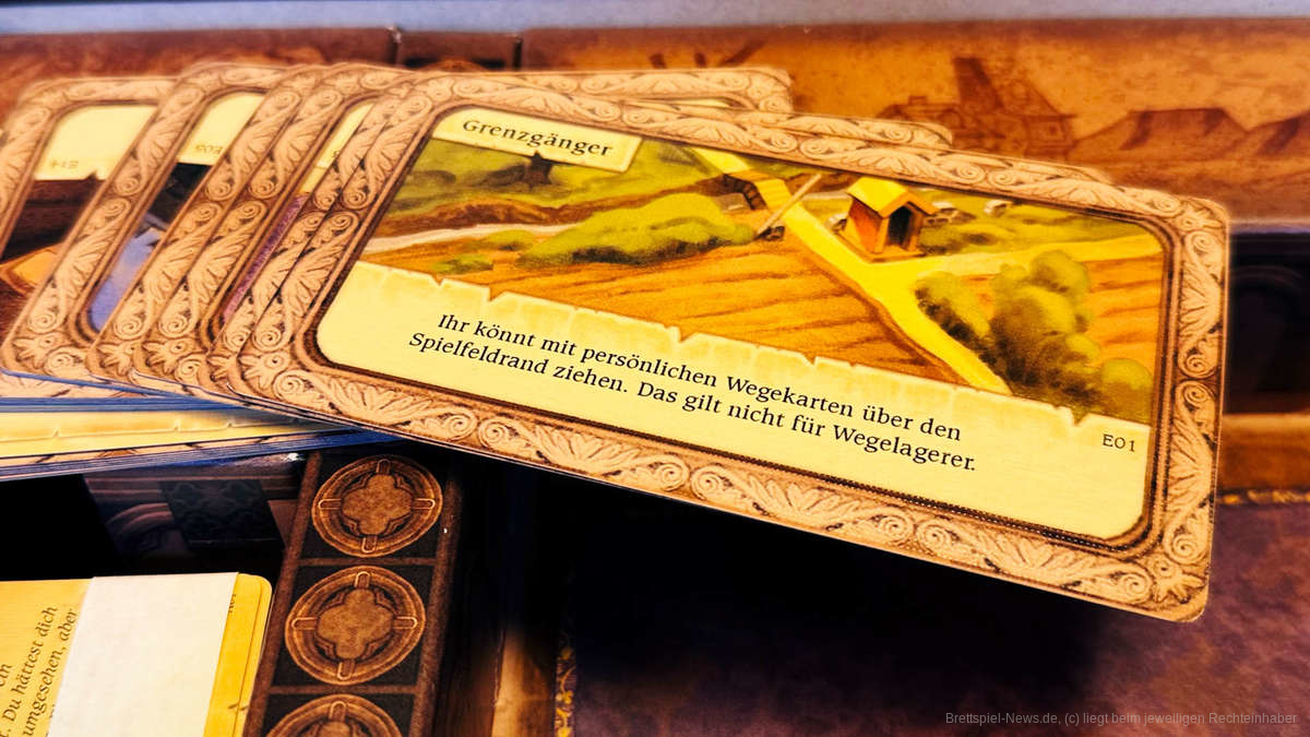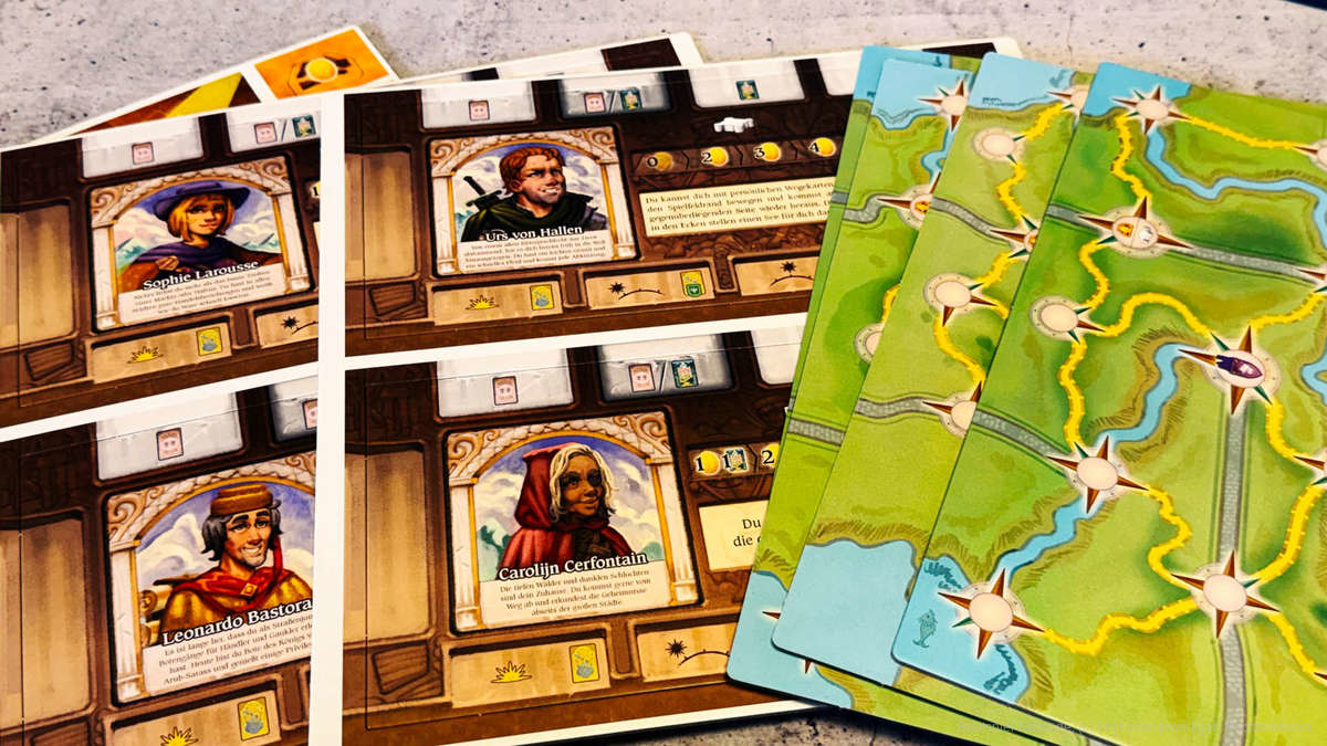 Zunächst wird der modulare Spielplan aus den vier Gebieten zusammengestellt und mit Plättchen und Holzmarkern versehen. Dabei handelt es sich um Städte, geheime Orte, Burgen, Gasthäuser und Wegelagerer. Die verschiedenen Wegpunkte sind über Pfade, Straßen und Wasserwege verbunden.