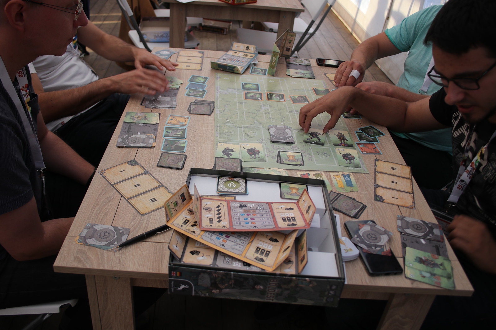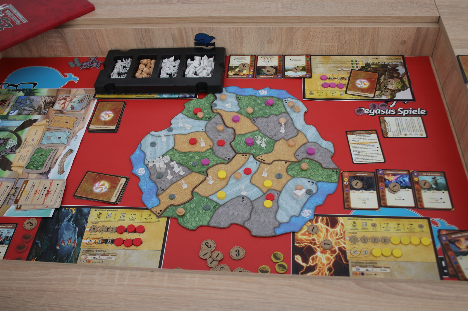 Nach einer Kurzen Stärkung ging es dann mit der Expertenspiel Neuheit „Spirit Island“ weiter. Hier spielen die Spieler kooperativ Naturgeister die versuchen die Insel vor Kolonisten zu verteidigen. Doch diese Wüten, bauen Dörfer und Städte und zerstören das Land und die Hütten der Eingeborenen. Ein Spiel das nicht zu unterschätzen ist in der Komplexität und im Management. Hier muss viel beachtet werden und in der ersten Partie ist das nicht so leicht zu durchschauen.