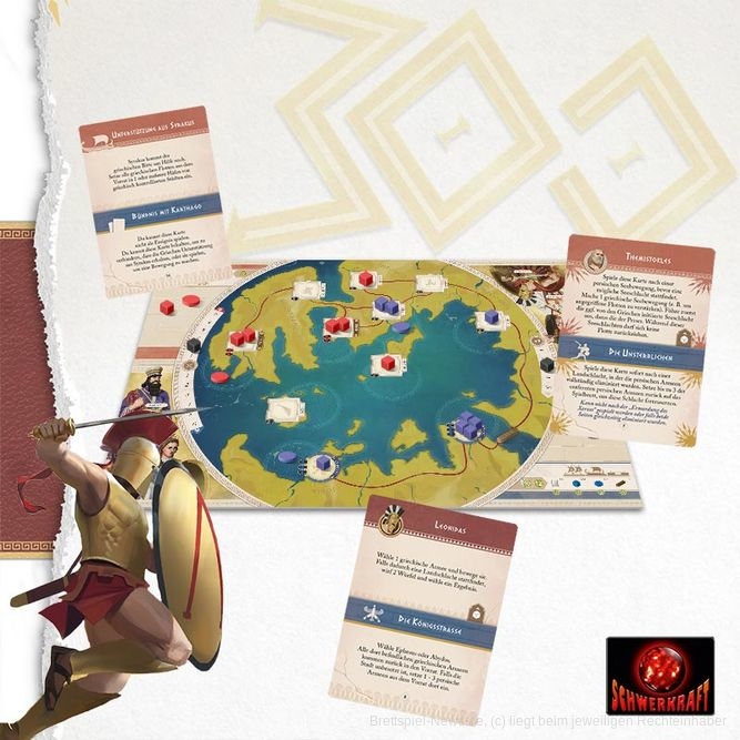 In der vergangenen Woche teilte der Schwerkraft Verlag mit, dass 300 – ERDE & WASSER ab sofort bestellbar ist. In dem Zweispieler-Kriegsspiel von Autor Yasushi Nakaguro treffen 2 Spielende als griechische Stadtstaaten und persisches Großreich um etwa 500 v. Chr. aufeinander. Die Illustrationen stammen von Nicolas Roblin und Antonio Stappaerts und die Spielzeit wird mit etwa 30 Minuten angegeben.