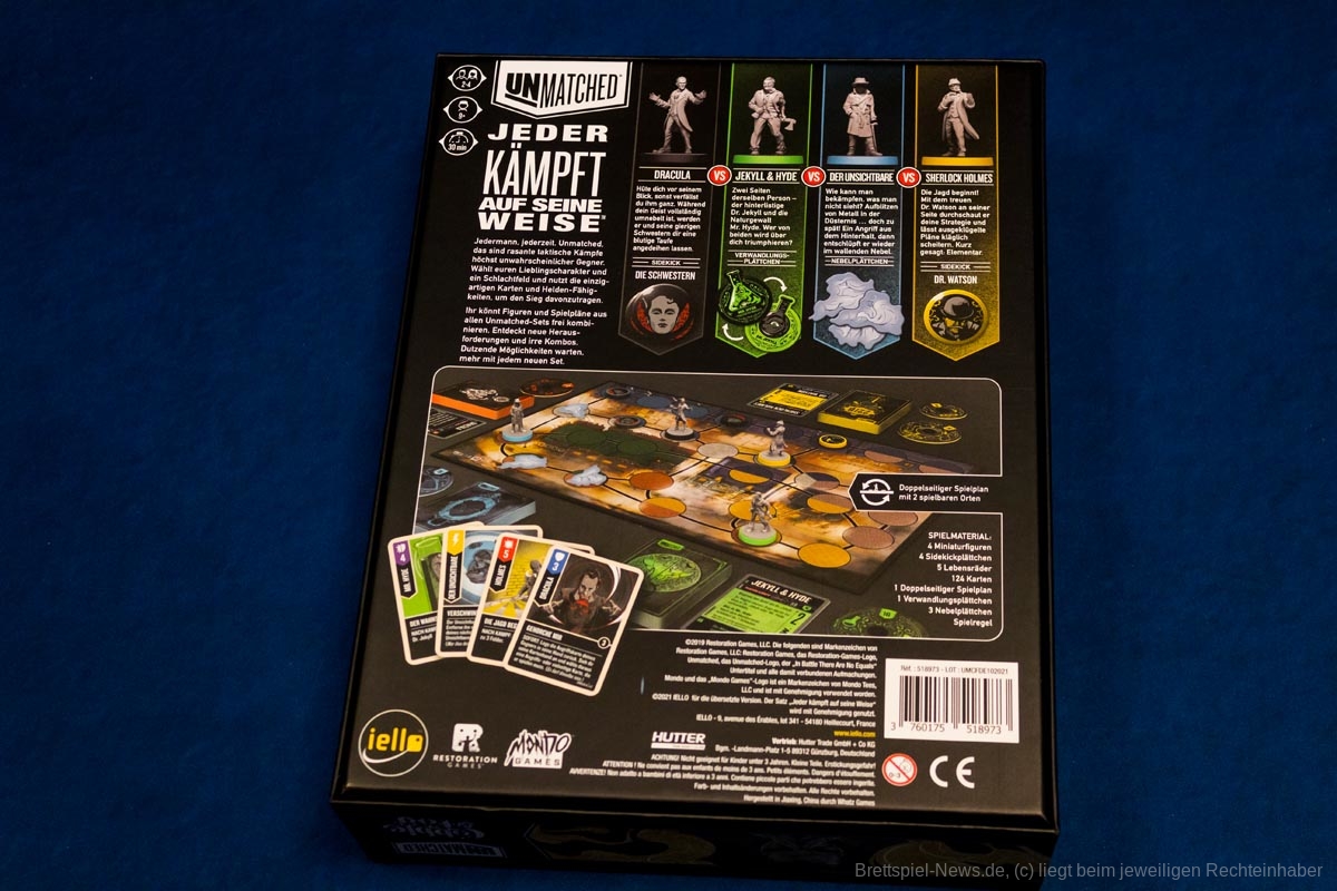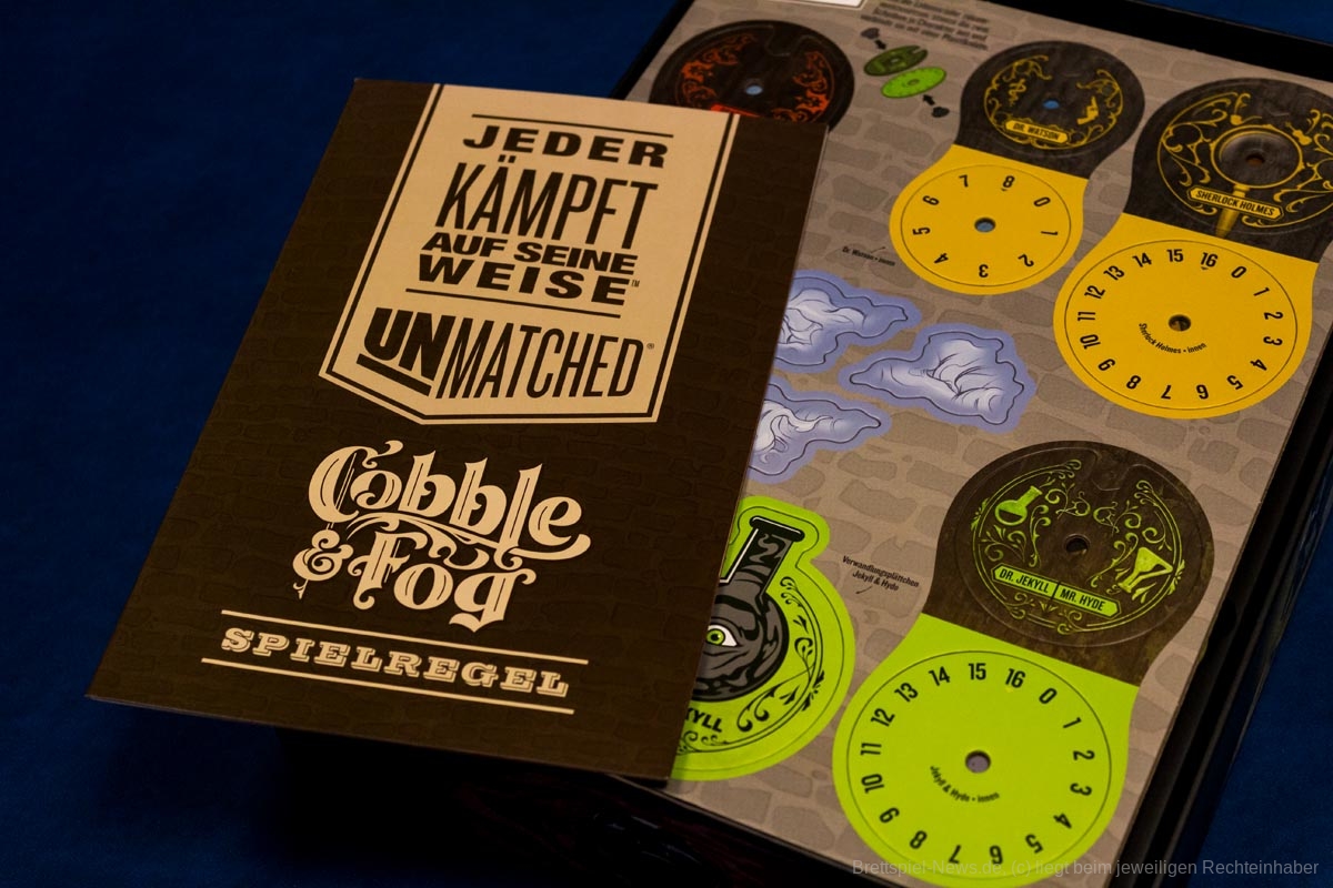 Die Unmatched Reihe wird mit „Unmatched – Cobble & Fog“ fortgesetzt. Das Spiel der Autoren Rob Daviau und Justin D. Jacobson ist nun auch in deutscher Sprache erhältlich. In „Cobble & Fog“ sind gleich vier neue Charaktere bzw. Duos enthalten: der unsichtbare Mann, Sherlock Holmes & Watson, Dracula und Jekyll&Hyde.