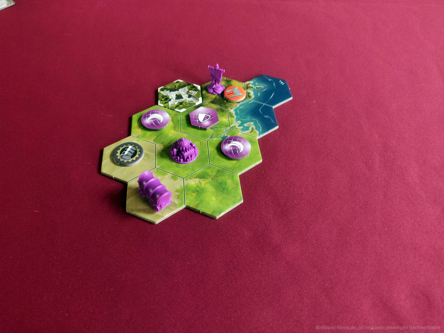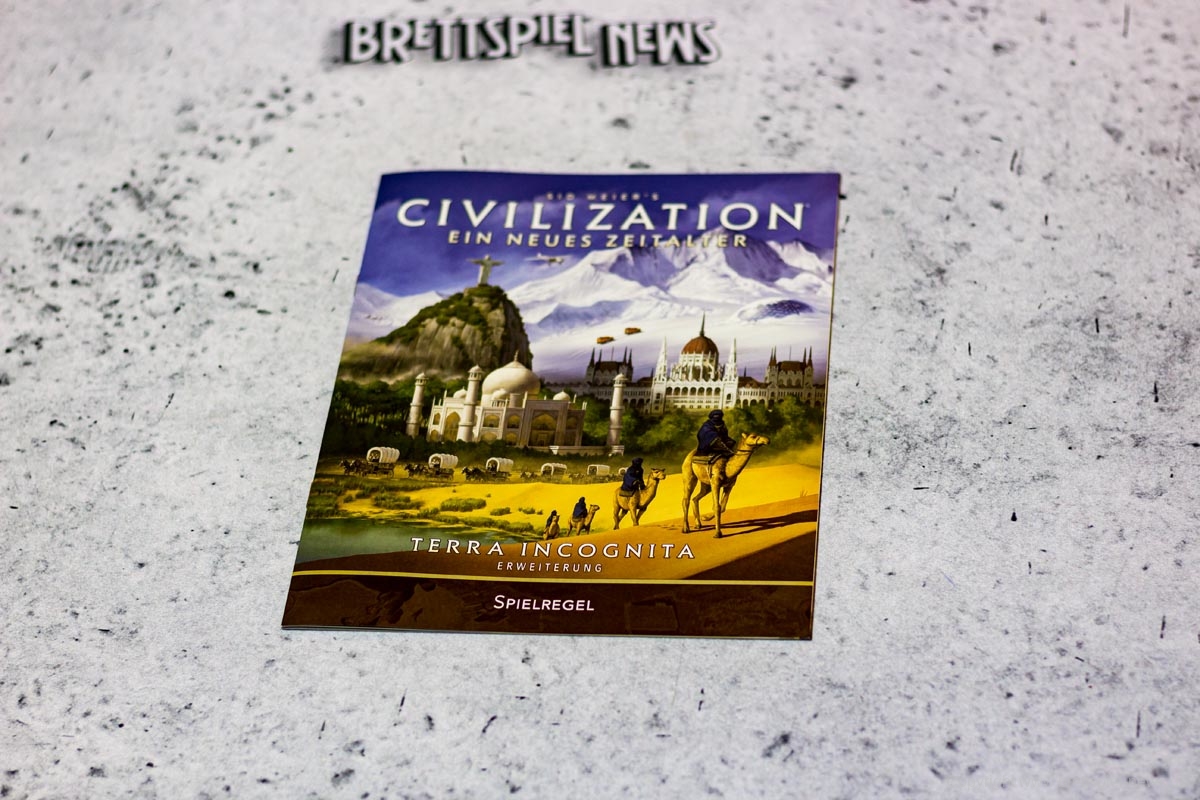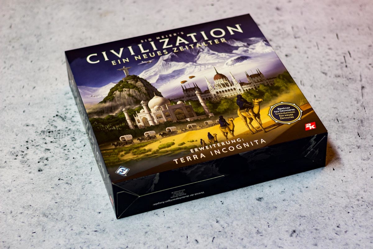 TERRA INCOGNITA ist eine Erweiterung für das strategische Brettspiel CIVILIZATION – EIN NEUES ZEITALTER. Diese ist mittlerweile erschienen und kommt in einer großen Box daher, so dass sie sich im Regal neben das Grundspiel stellen lässt. Das hat aber zur Folge, dass doch recht viel Luft im Karton vorhanden ist. Wer das Inlay vom Grundspiel entfernt wird das Material in der Grundbox problemlos unterbekommen. Ansonsten passt das Material wie erwartet bestens zum Grundspiel und ermöglicht unter anderem spielen mit fünf Spielern.