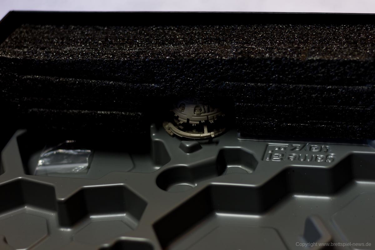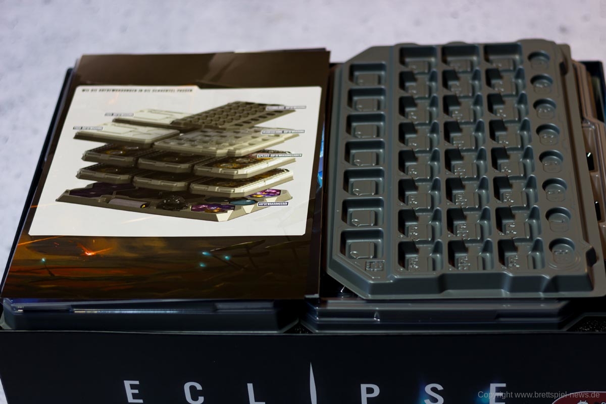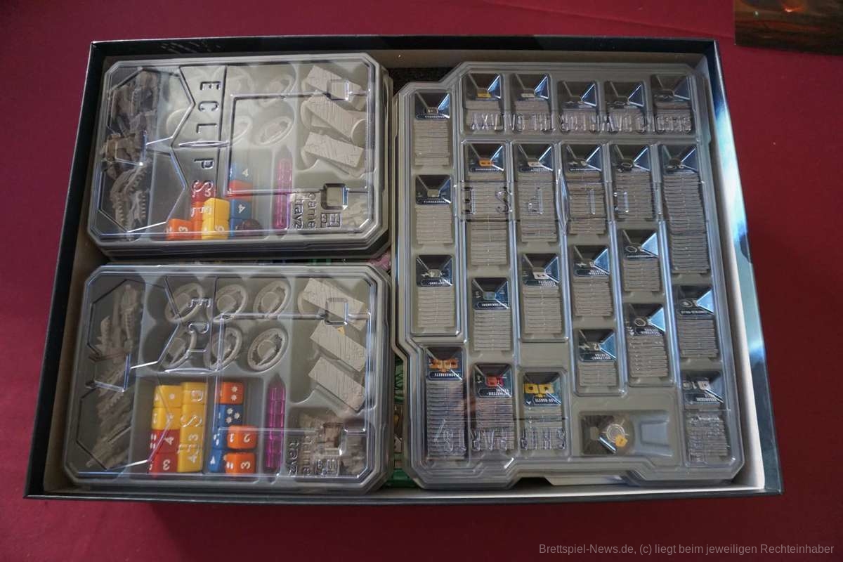 ECLIPSE: SECOND DAWN FOR THE GALAXY ist nun verfügbar und wir zeigen Bilder der deutschen Ausgabe, die bei PEGASUS erschienen ist. Die Neuauflage ist sehr aufwendig produziert und muss sich in der Materialausführung nicht vor hochwertig produzierten Kickstarter-Projekten verstecken. Inlays fassen das ganze Spielmaterial, welches ebenfalls hochwertig produziert wurde. Dafür hat die Box aber auch epische Außmaße, was viele Spieler ebenfalls schon von zahlreichen Kickstarter-Projekten gewohnt sind. Eine Partie des Spiel soll 50-150 Minuten beanspruchen, was bei 2-6 Spielern eine wirklich gute Spielzeit bedeuten würde.