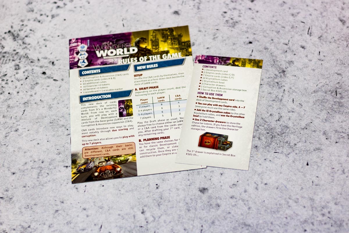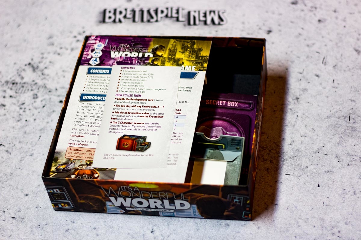 Die Erweiterung CORRUPTION & ASCENSION für die englische Version von EINE WUNDERVOLLE WELT ist mittlerweile an die KICKSTARTER Unterstützer ausgeliefert worden. Wir haben unser Exemplar gesendet bekommen und zeigen die Bilder vom Spielmaterial.