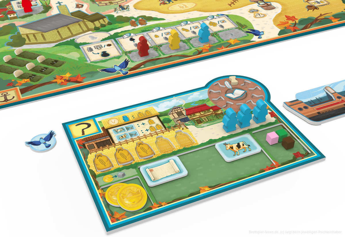 Genauer gesagt, nimmt man sich in jedem Zug einen Würfel aus einem Bereich auf dem Spielbrett und führt dann die Aktion dieses Bereichs aus. Auf dem Spielplan befinden sich Zonen mit bestimmten Eigenschaften, ein Markt, eine Reisezone, eine Handwerkszone, eine Kirche und ein Ratshaus, und jede Zone ist mit Würfeln in vier Farben, sowie mit schwarzen Würfeln bestückt, die als Fluch dienen. Viele dieser Gebiete bieten mehrere Aktionen an. Wenn Sie beispielsweise einen Würfel aus dem Handwerksgebiet nehmen, können Sie einen Ochsen, ein Pferd, einen Wagen, einen Pflug oder eine Schriftrolle erhalten oder Weizen in Gold umwandeln. Das Spiel endet, wenn entweder die Dorfchronik oder der anonyme Friedhof voll ist.