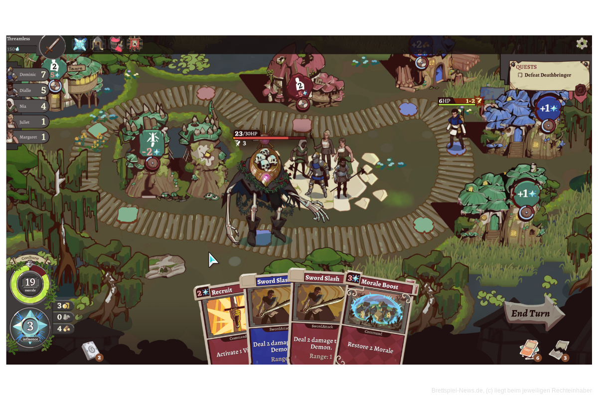 Mit einem wachsenden Kartendeck müsst ihr Runde um Runde meistern. Baut und repariert Gebäude, versammelt Dorfbewohner und verbessert eure Fähigkeiten. Neue Gegenstände und Fähigkeiten helfen euch dabei, die Dämonen zu besiegen, die das Land heimsuchen.