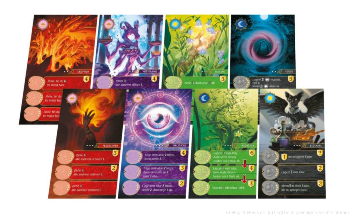 Für diesen Wettbewerb versammelt ihr euch um den Vortex und füllt eure Zauberbücher mit neuen Zaubern. Der Vortex gibt magische Essenz, sogenannte Materia, an die Umwelt ab, die sich auf dem Altar sammelt. Ihr benötigt diese Materia, um neue Zauber zu lernen oder um sie bei euren Geistergefährten zu lagern, den sogenannten Vertrauten. Für beides bekommt ihr am Spielende Punkte. Der Wettbewerb endet, sobald jemand von euch alle Zauber gelernt hat oder keine Materia mehr lagern kann. Wer am Ende die meisten Punkte hat, gewinnt den Wettbewerb.