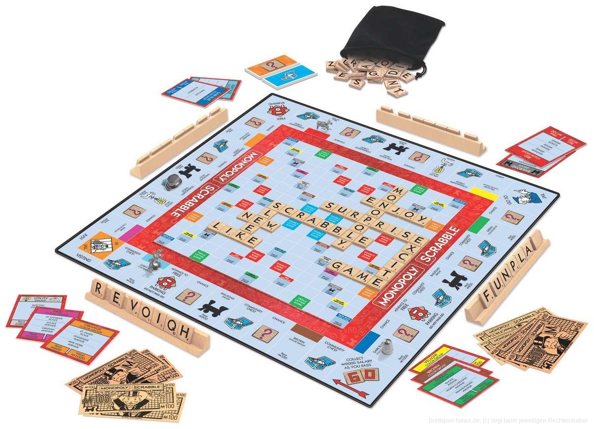 Hasbro und Winning Move Games (USA) haben „Monopoly Scrabble“, eine Mischung aus beiden Massenmarkt-Spiele, angekündigt. Darin werden tatsächlich auch die beiden Spielprinzipien kombiniert. Das Spiel soll wohl noch diesen Herbst erscheinen. Auf der deutsche Hasbro-Website ist allerdings noch nichts von der neuen Kreation zu sehen.