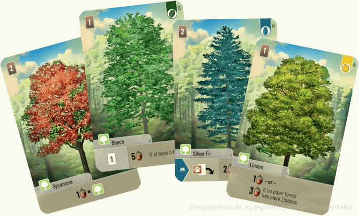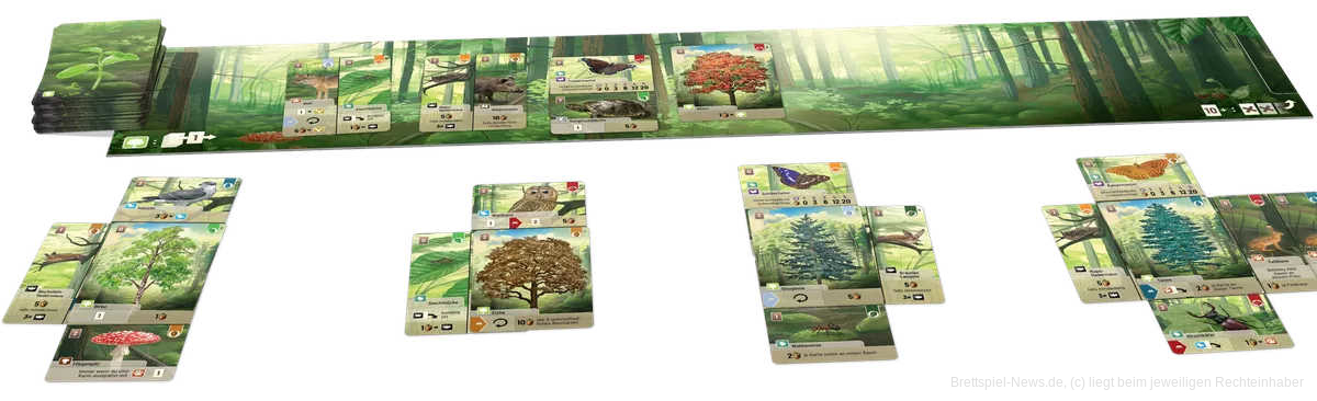 Zu Beginn hat jeder Spieler sechs Karten auf der Hand, die entweder eine bestimmte Baumart oder zwei Waldbewohner (Tier, Pflanze, Pilz usw.) darstellen. Die Waldbewohnerkarten sind dabei vertikal oder horizontal in zwei Hälften geteilt, wobei sich in jeder Kartenhälfte ein Waldbewohner befindet.