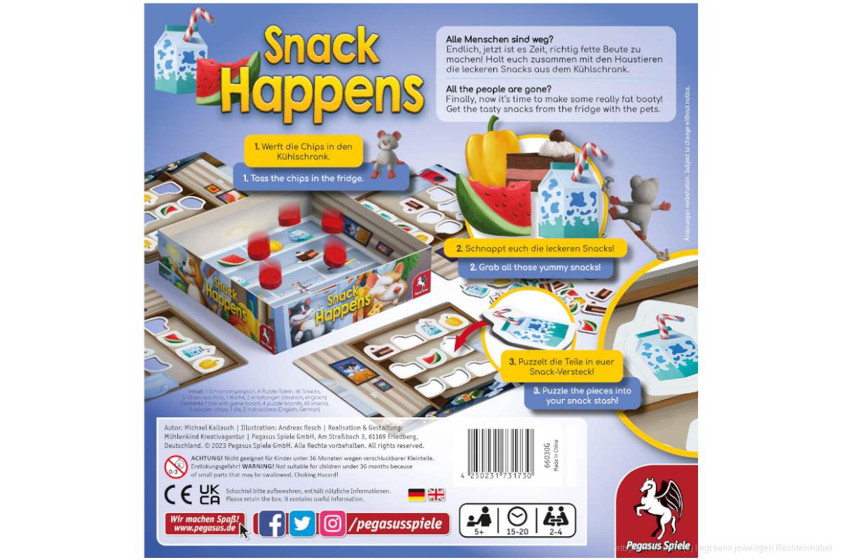 Im Kinderspiel „Snack Happens“ versucht ihr als Tiere euer Geheimversteck mit Essen zu füllen – und das möglichst schnell. Das Spiel richtet sich an 2-4 Personen ab 5 Jahren und dauert ca. 15-20 Minuten. Im September soll „Snack Happens“ erscheinen. Die UVP wird mit 24,99€ angegeben.