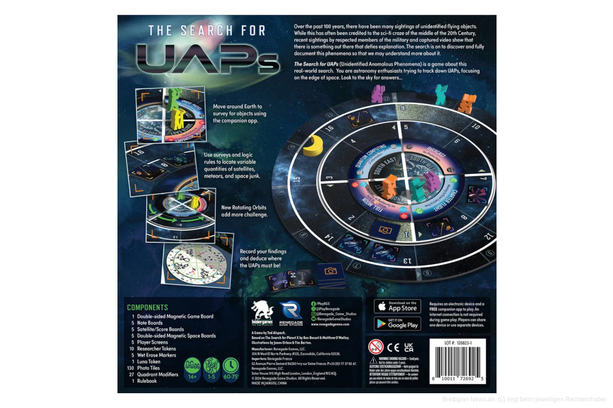 Renegade Game Studios haben ein neues Spiel von Ted Alspach („Die Schlösser des König Ludwig“, „Age of Steam“) angekündigt. Diesmal handelt es sich um ein Deduktions-Spiel, das auf der tatsächlichen Suche nach sogenannten UAPs (unidentified aerial phenomenon, dt. 'unidentifiziertes Luftraum-Phänomen') basiert. „The Search for UAPs“ richtet sich an 1-5 Personen ab 14 Jahren und soll rund 45-60 Minuten dauern.