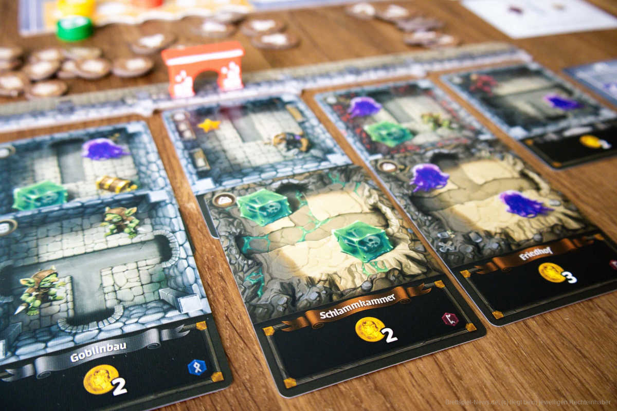 - Verbessern: Nun könnt ihr Marktplättchen kaufen, um die Räume... „auszuschmücken“. Denn wer will sich schon in einem Verlies ohne Bonus-Schleim aufhalten?!