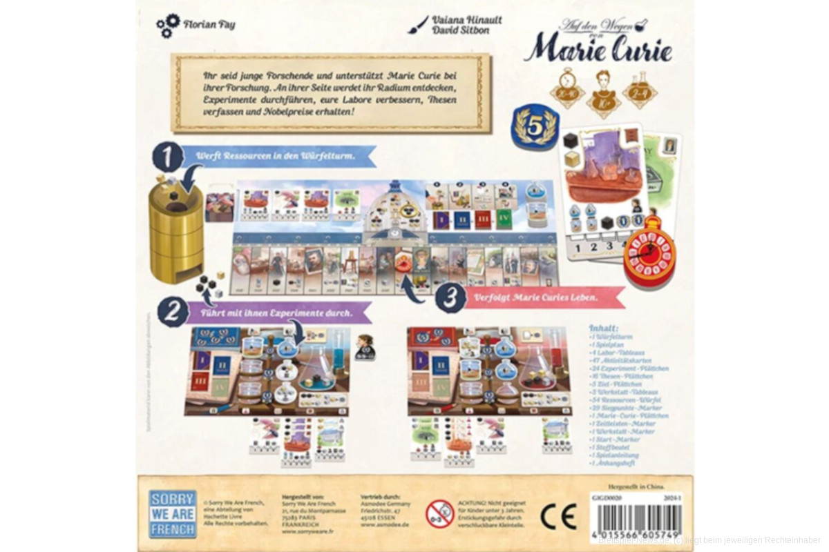Auf der Zeitleiste des Spielplans ist das Leben der berühmten Wissenschaftlerin dargestellt mit allen Meilensteinen, was für ein dynamisches Gameplay sorgen soll. Der enthaltende Würfelturm soll für spannende Momente sorgen und die experimentelle Thematik des Spiels unterstreichen.