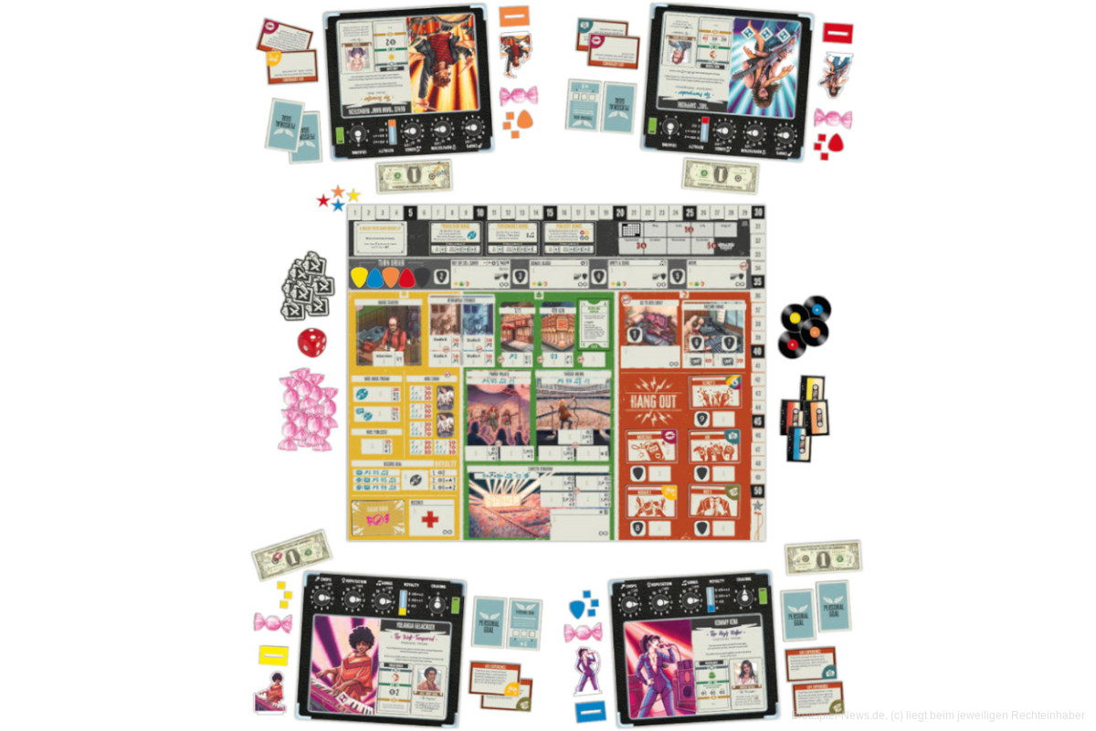 Schafft ihr es in der vorgegebenen Zeit, Konzerte zu spielen, Alben aufzunehmen und vieles mehr, um richtig bekannt zu werden, gewinnt ihr das Spiel.
