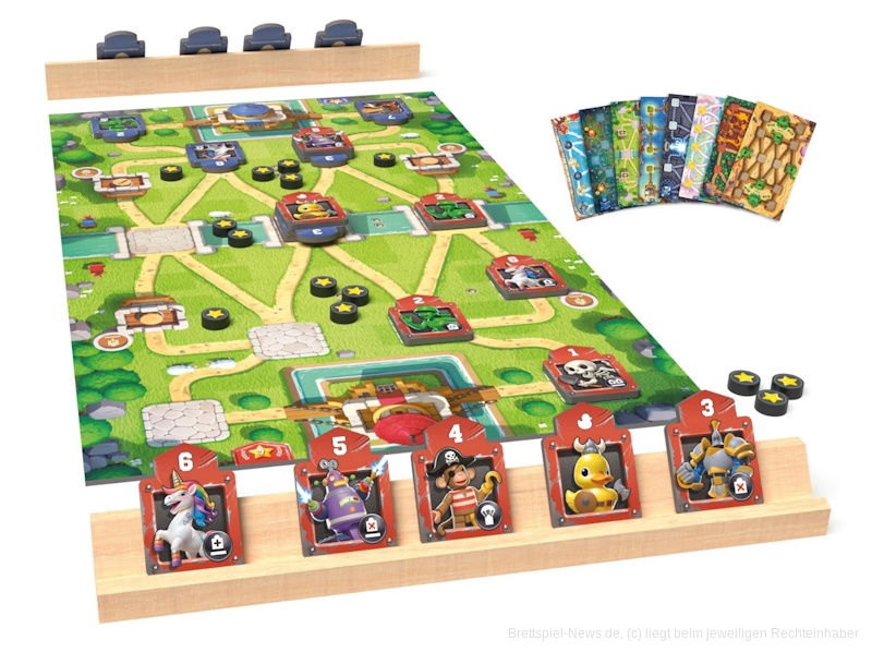 Aber nun der Reihe nach: Nachdem sich die Duellanten auf einen Geländeplan geeinigt haben, wird ein Startspieler zufällig bestimmt. Jeder der acht Einheitentypen ist vierfach pro Seite enthalten und besitzt eine Stärke sowie meist einen Soforteffekt. Aus den 24 Truppenkarten werden jeweils vier zurück in die Schachtel gelegt. Der Startspieler zieht drei, der Gegner vier Karten und sie stellen diese jeweils auf den beiliegenden Holzständer ab.