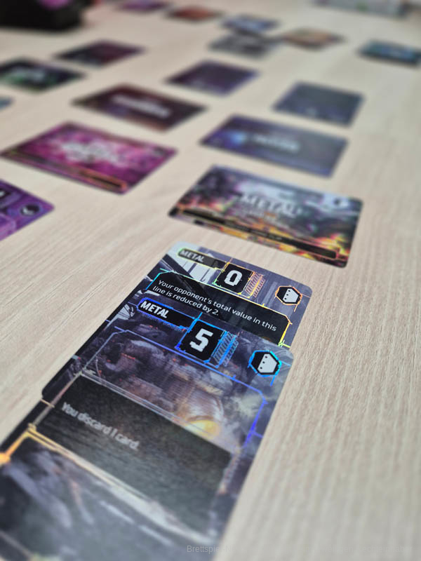 Doch nun der Reihe nach: zunächst draften beide Spieler sich ihr Deck aus drei der zwölf Themensets zusammen - Die Sets bestehen aus jeweils sechs Befehls- und einer Protokoll-Karte. Die Befehlskarten werden gemeinsam gemischt und bilden den Nachziehstapel. Die Protokolle werden in jeweils drei Reihen Kopf an Kopf auf die nicht kompilierte Seite gelegt.