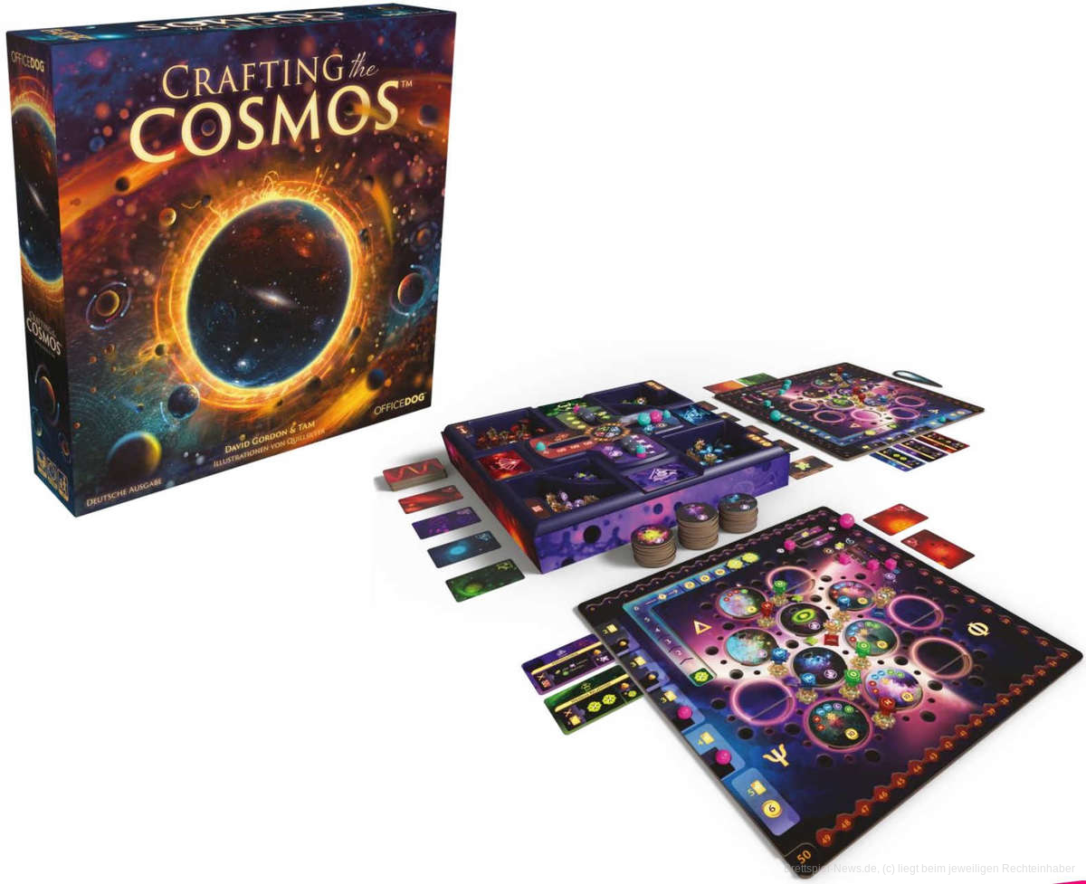 In Crafting the Cosmos wetteifern Spieler als interstellare Architekten darum, die Galaxie zu erschaffen. Durch geschicktes Platzieren von Energie auf dem Spielbrett sammeln sie Ressourcen, um Sterne, Nebel und sogar Leben zu formen. Neben strategischem Ressourcenmanagement spielen Energie- und Machtkarten eine wichtige Rolle, um Vorteile zu erlangen. Zudem konkurrieren die Spieler um universelle Ziele, die zusätzliche Punkte bringen.