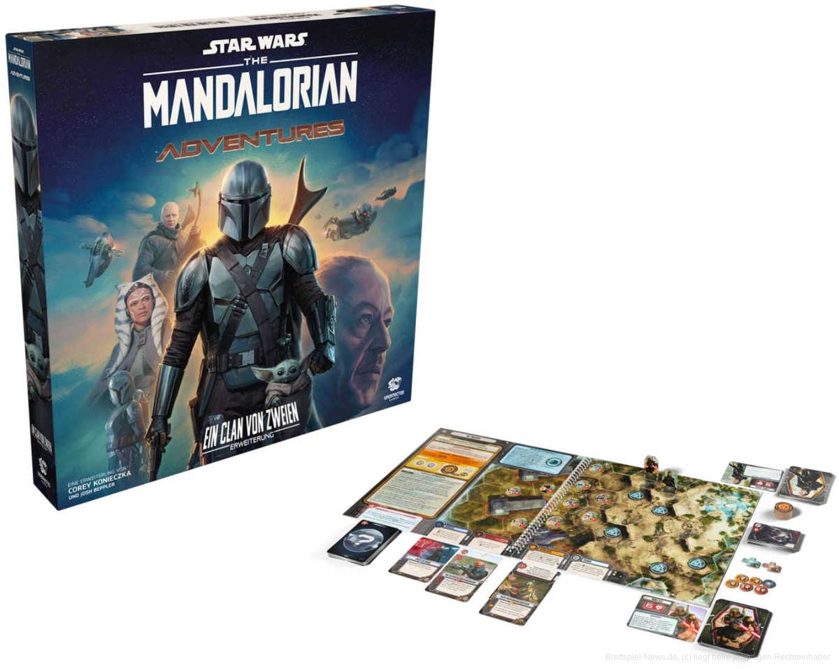 Die Ein Clan von Zweien Erweiterung für The Mandalorian: Adventures erweitert das Grundspiel um neue Missionen, Charaktere und Herausforderungen, inspiriert von der zweiten Staffel der Serie. Spieler schlüpfen in die Rollen von vier neuen Charakteren mit einzigartigen Fähigkeiten und erleben spannende Story-Missionen an vier neuen Schauplätzen, wodurch sich die Anzahl der Karten im Spiel verdoppelt. Zusätzlich gibt es vier abwechslungsreiche Söldnermissionen.
