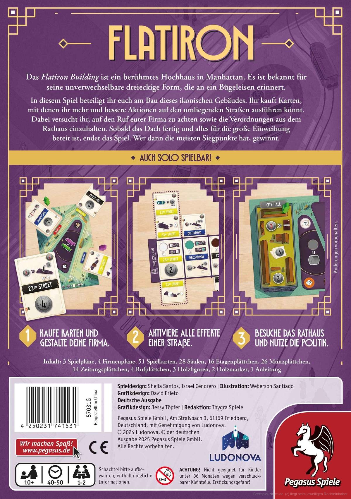 Das Autorenduo Sheila Santos und Israel Cendrero fügt seiner beachtlichen Sammlung an Spielen zu historischen Bauwerken ein weiteres hinzu. Kosmos vertreibt bereits “Die Rote Kathedrale” (2021) und “Die Weiße Burg” (2023). Nun erscheint Ende März 2025 mit “Flatiron” ein Duell-Spiel im Hause Pegasus in deutscher Ausgabe.