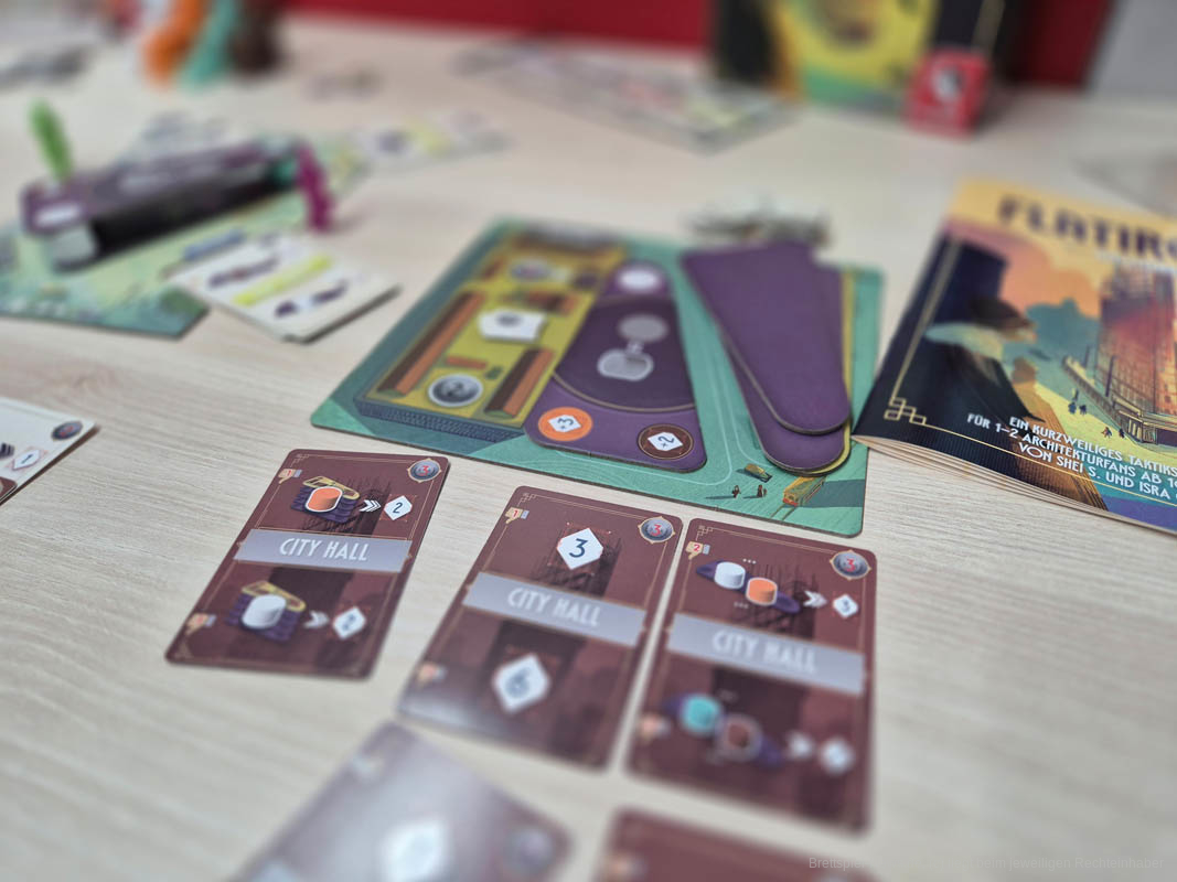 Zunächst einmal eine einnehmende Tischpräsenz. Über die Runden wächst das Gebäude Säule um Säule, Etage um Etage bis zu einer fünfstöckigen Sehenswürdigkeit. Der Spielplan mit Auslassungen für die Kartenstapel ist dem Bauplatz nachempfunden und die vier Kartenstapel entsprechen den umliegenden Straßen.