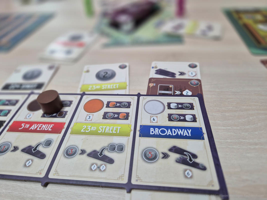 Die gekauften Karten können entweder an den Anfang oder das Ende der Sequenz pro Spalte gelegt werden und bringen dort jeweils unterschiedliche Effekte. Sie müssen allerdings in der aufgedruckten Straße platziert werden. Die Karten des Rathauses bieten keinen Bonus bei Aktivierung, sondern erst am Spielende, dafür lassen sie sich in jeder Spalte platzieren.