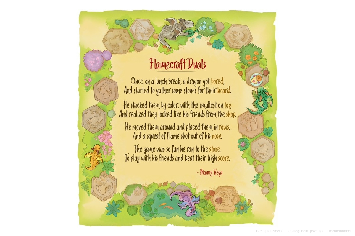 Mit „Flamecraft Duals“ hat der Verlag „Cardboard Alchemy“ nun eine Kickstarter-Kampagne an den Start gebracht, die das beliebte Flamecraft-Universum um ein eigenständiges 2-Personen-Spiel erweitert. In „Flamecraft Duals“ kehrt Autor Manny Vega zurück in die von Sandra Tang illustrierte Welt der putzigen Drachenwesen und verspricht kurzweiliges Spielvergnügen für 1-2 Drachen-Duellierende ab 10 Jahren.