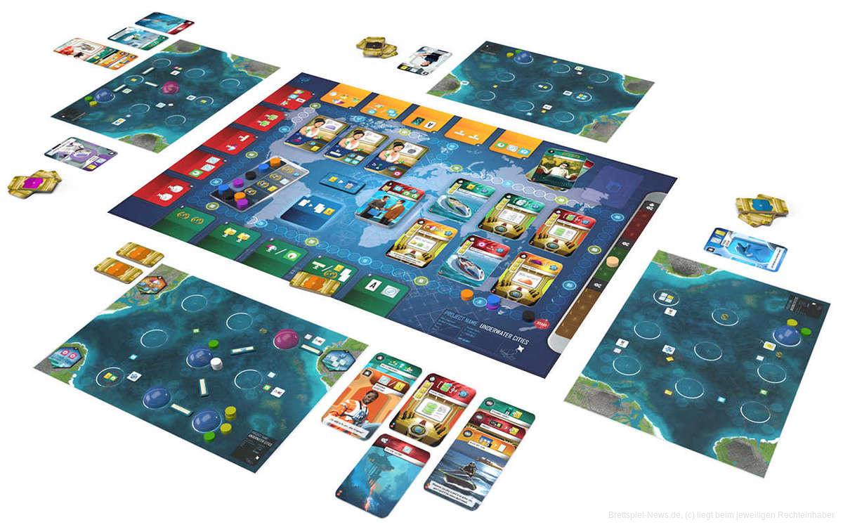 In Underwater Cities übernehmen die Spielenden die Rolle führender Wissenschaftler, die neue Lebensräume unter Wasser errichten sollen, als eine Reaktion auf die Überbevölkerung der Erde.
