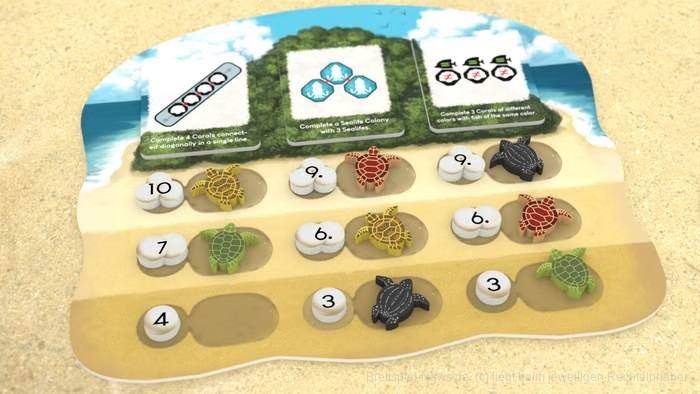 🐢Schildkröten! Mit der Erweiterung “Nesting Season” wird der kompetitive Anteil des Spiels erhöht. Durch das schnellstmögliche Erreichen von Zusatzaufgaben winken Extrapunkte. Zusätzlich gibt es neue Korallen- und Aufgabenplättchen für mehr Varianz im Spielgeschehen.