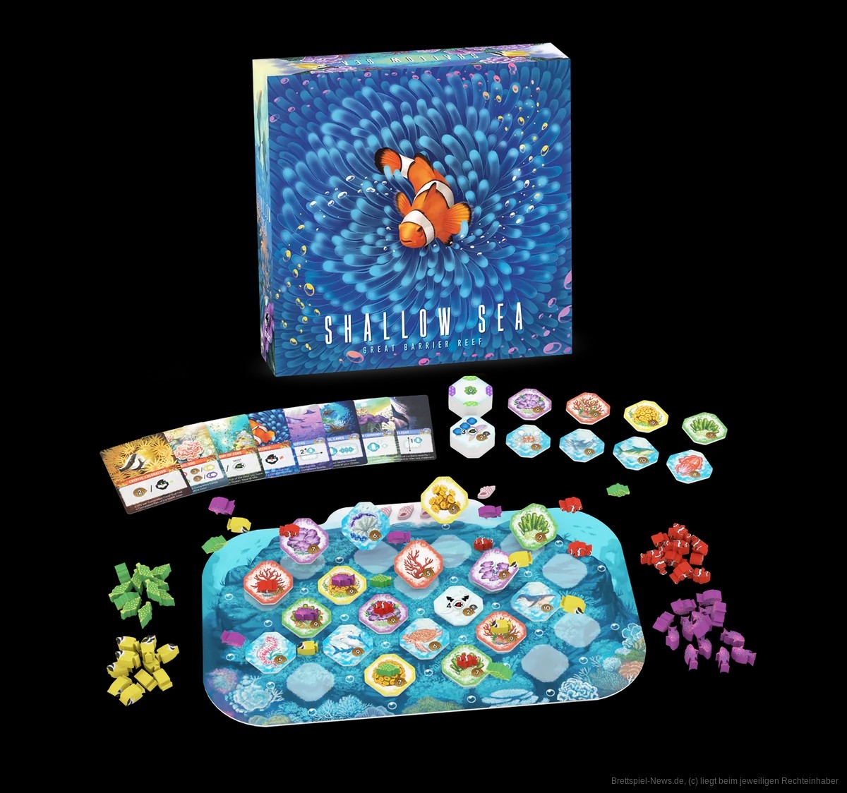 Damit folgt das Spiel seinen Vorgängern von Bad Comet Games “Life of the Amazonia” und “Wundersame Wesen”. Letzteres stammt sogar vom selben Autoren Yeom Cheolwoong. Sophia Kang hat die Unterwasserwelt illustriert und neben den erstgenannten Spielen auch schon bei “Wilde Serengeti” Talent für Tierdarstellungen bewiesen.