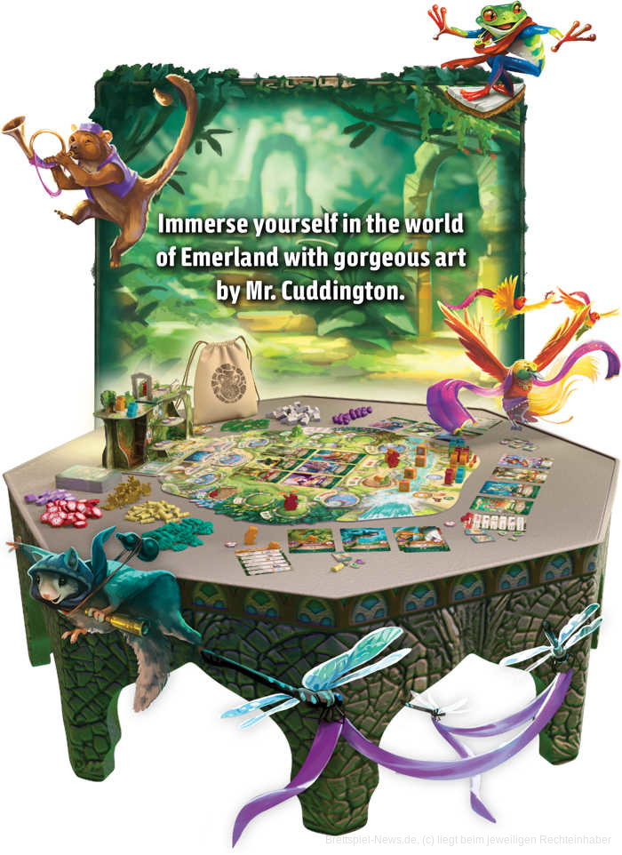 In Emerland übernimmst du die Rolle eines dieser Waldwesen und führst eine Gemeinschaft an, die versucht, im Herzen des Dschungels eine prächtige Stadt zu errichten. Dazu entsendest du deine Arbeiter an verschiedene Orte, um Ressourcen zu sammeln, wertvolle Karten auszuspielen und deine Stadt wachsen zu lassen. Jede Karte bringt neue Möglichkeiten, Boni oder Siegpunkte und mit jedem Zug wächst dein Einfluss in dieser lebendigen Welt.