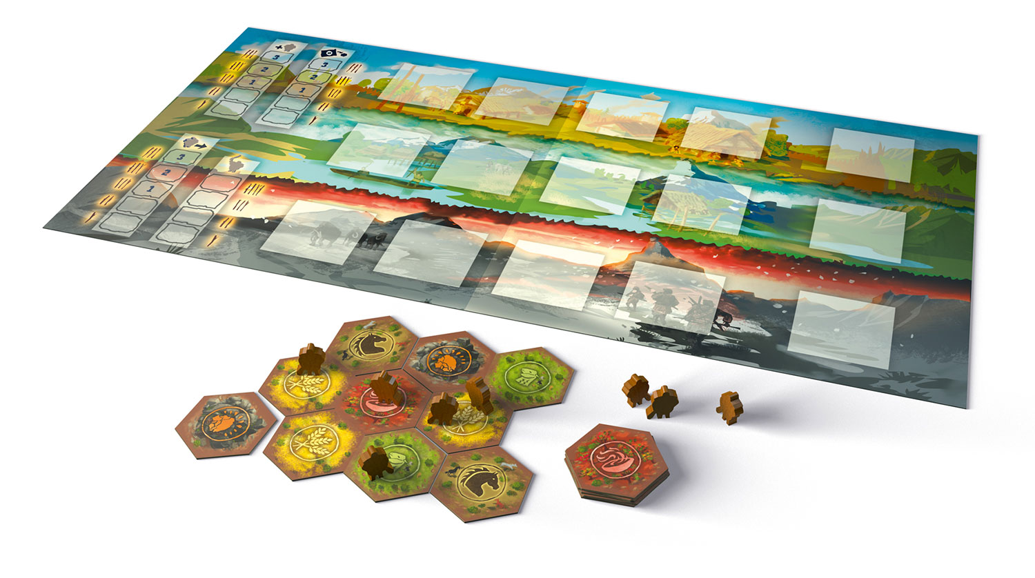 Inhalt: 1 Spielplan, 60 Stammesmitglieder, 60 Markierungssteine, 16 Fortschrittsanzeiger, 1 Startspielerzeichen, 15 Entwicklungstafeln, 24 Ereignistafeln, 6 Aktionstafeln, 50 Landschaftsfelder, 20 Muschelplättchen, 30 Siegpunktplättchen, 1 Stoffbeutel, 1 Spielregel