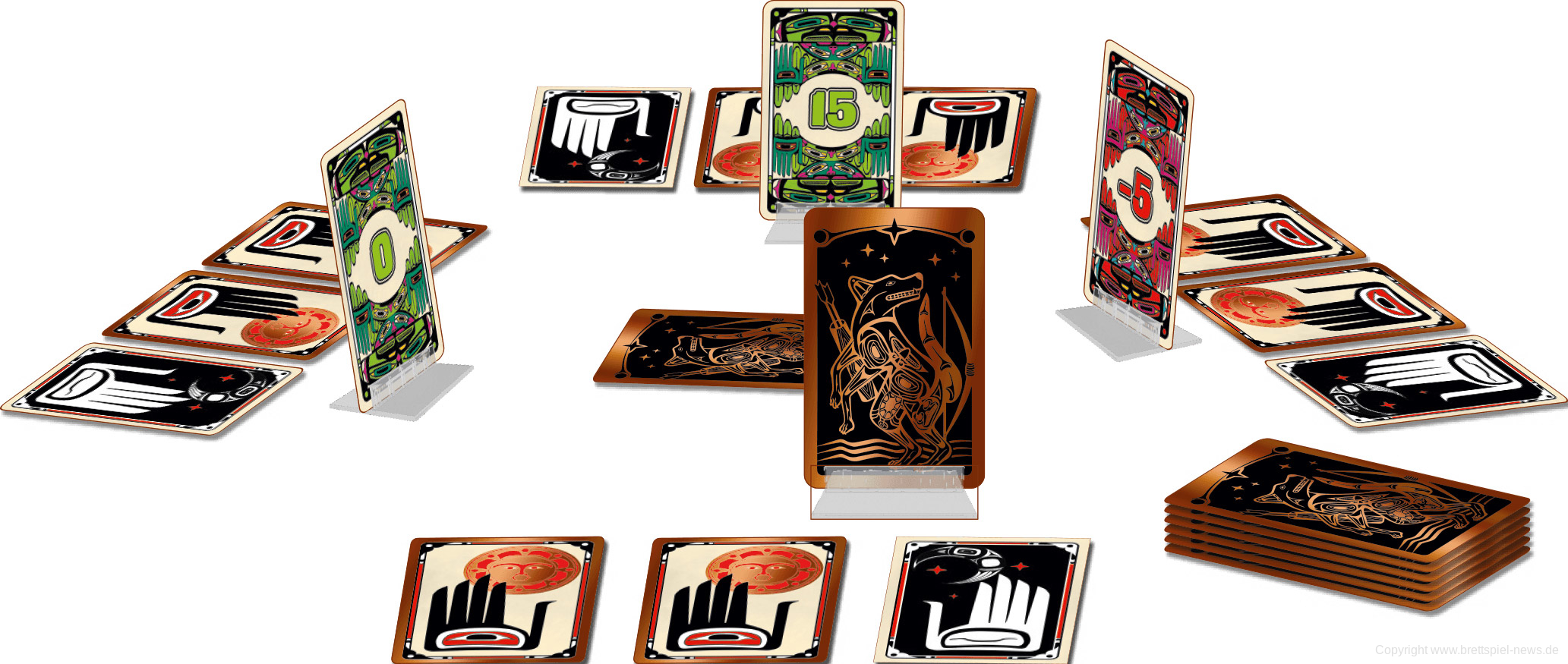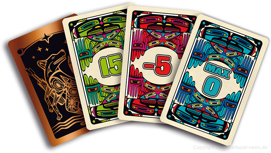 Die traditionelle Formensprache der amerikanischen Nordwestküste verleiht Coyote von HeidelBÄR Games eine ganz eigene Identität. Man sagt, in den nordamerikanischen Muttersprachen gäbe es kein Wort für Kunst, sie verwandeln einfach etwas Praktisches in etwas Schönes. So wie es die Illustratorin Zona Evon Shroyer hier mit den Spielkarten von Coyote getan hat. Die traditionelle Kunst der Nordwestküste ist detailliert, kann recht komplex sein und erfordert Jahre des Studiums und der Praxis, um so außergewöhnlich anmutende Kunstwerke zu schaffen, wie es bei dem Coyoten auf dem Cover zu sehen ist. Die Gestaltung beinhaltet dabei Symboliken für Gleichgewicht, Vollendung, Neuanfang, Geburt, Leben, Positivität, Fülle, Glauben, den Adler, Kojoten, Schildkröte, Bär und den Biber.