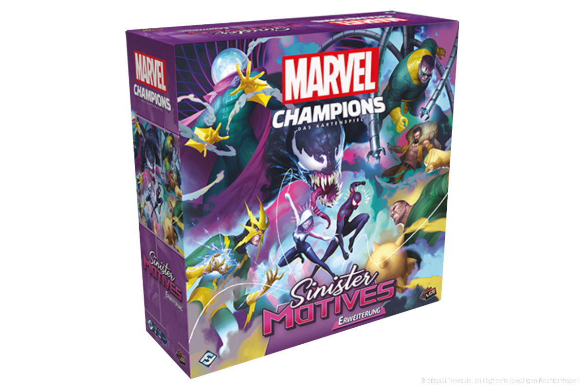 Neben dem Heldenpack kommt auch eine Kampagnen-Erweiterung: SINISTER MOTIVES. Diese Erweiterung ist im Spiderverse angesiedelt und bietet dementsprechend zwei neue Helden: GHOST SPIDER und SPIDERMAN (MILES MORALES). Als Gegenspieler und -spielerinnen kommen bekannte Spiderman-Schurken ins Spiel: SANDMAN, VENOM und die SINISTER SIX.