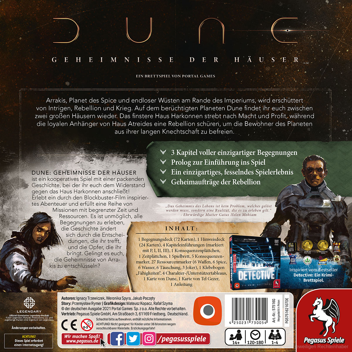 DUNE – GEHEIMNISSE DER HÄUSER ist ein kooperatives Spiel, das auf dem Prinzip von Detective – Ein Krimi-Brettspiel beruht. Die Spielerinnen und Spieler schließen sich dem Widerstand gegen das Haus Harkonnen an und erleben gemeinsam eine packende Geschichte. In dem vom Blockbuster-Film inspirierten Abenteuer erfüllen sie eine Reihe von Missionen mit begrenzter Zeit und Ressourcen. Es ist unmöglich, alle Begegnungen zu erleben, die Geschichte ändert sich durch die Entscheidungen, die die Spieler treffen und die Opfer, die sie bringen. Gelingt es ihnen, die Geheimnisse von Arrakis zu entschlüsseln?