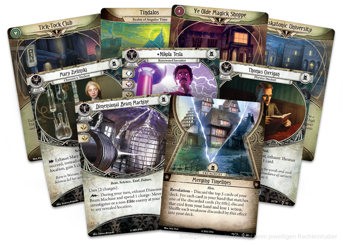 Im neuen Szenario Machenschaften in der Zeit für Arkham Horror: Das Kartenspiel gibt es drei verschiedene Zeitebenen: Die Vergangenheit, das Heute und die Zukunft. Das Szenario wurde als unterhaltsames, interaktives Erlebnis gestaltet und kann entweder als Einzelspielszenario gespielt oder als Nebengeschichte in eine Kampagne integriert werden.