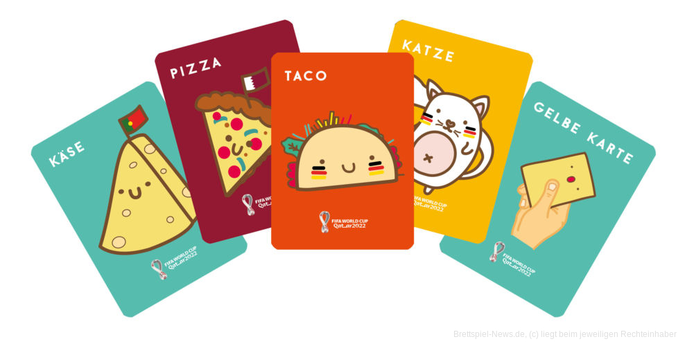 Pünktlich zur Fußball-WM erscheint im November eine von der FIFA offiziell lizensierte Version von „Taco Katze Ziege Käse Pizza“. Das schnelle Partyspiel aus dem Jahr 2018 stammt vom französischen Verlag Blue Orange und wird von Asmodee vertrieben. Es ist für 2-8 Personen ab 8 Jahren und hat eine Spielzeit von etwa 10 Minuten. Vor kurzem wurde bereits mit „Voll verdreht" eine neue Version angekündigt.