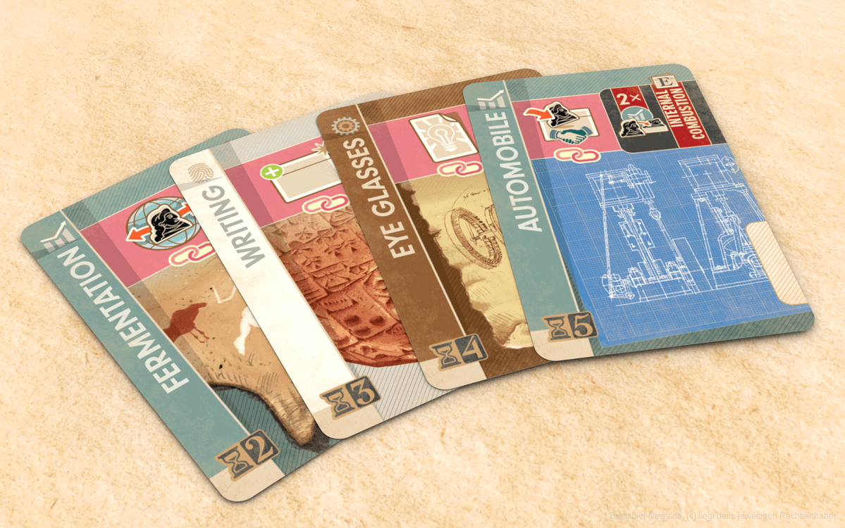 In „Inventions“ simulieren die Karten diese neuen Konzepte. Die Karten sind die Ideen, die schließlich zu Erfindungen werden. Sobald sie erfunden sind, können diese Technologien mit der Welt geteilt werden, und alle, die in den Prozess involviert sind, verbreiten die aufregenden Neuigkeiten und zollen Anerkennung, wo Anerkennung fällig ist. Die Entwicklung dieser Erfindungen bringt die Gesellschaft voran und fördert ihre Technologie, Wirtschaft und Kultur.
