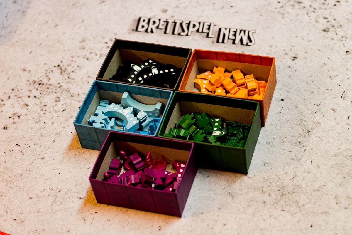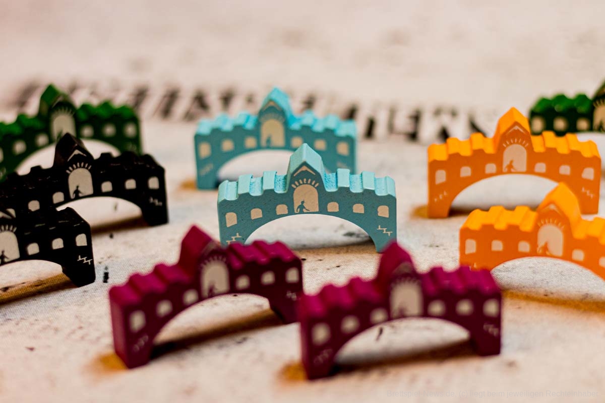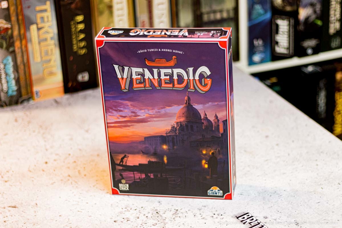 Mit Venedig ist bei GIANT ROC ein Spiel für 1 bis 5 Vielspieler erschienen. Es wurde durch die Spieleschmiede finanziert und entstammt dem Autoren-Duo DÁVID TURCZI und ANDREI NOVAC. Die Grafik kommt von BARTLOMIEJ ROCZNIAK. Das Spielmaterial ist hochwertig denn es gibt neben kleinen Gondel-Miniaturen zahlreiche Holzfiguren, Holzbögen und einen doppelseitig bedruckten Spielplan. Die enthaltenen Behälter helfen das Spielmaterial sicher aufzubewahren und den Spielstart deutlich zu beschleunigen.