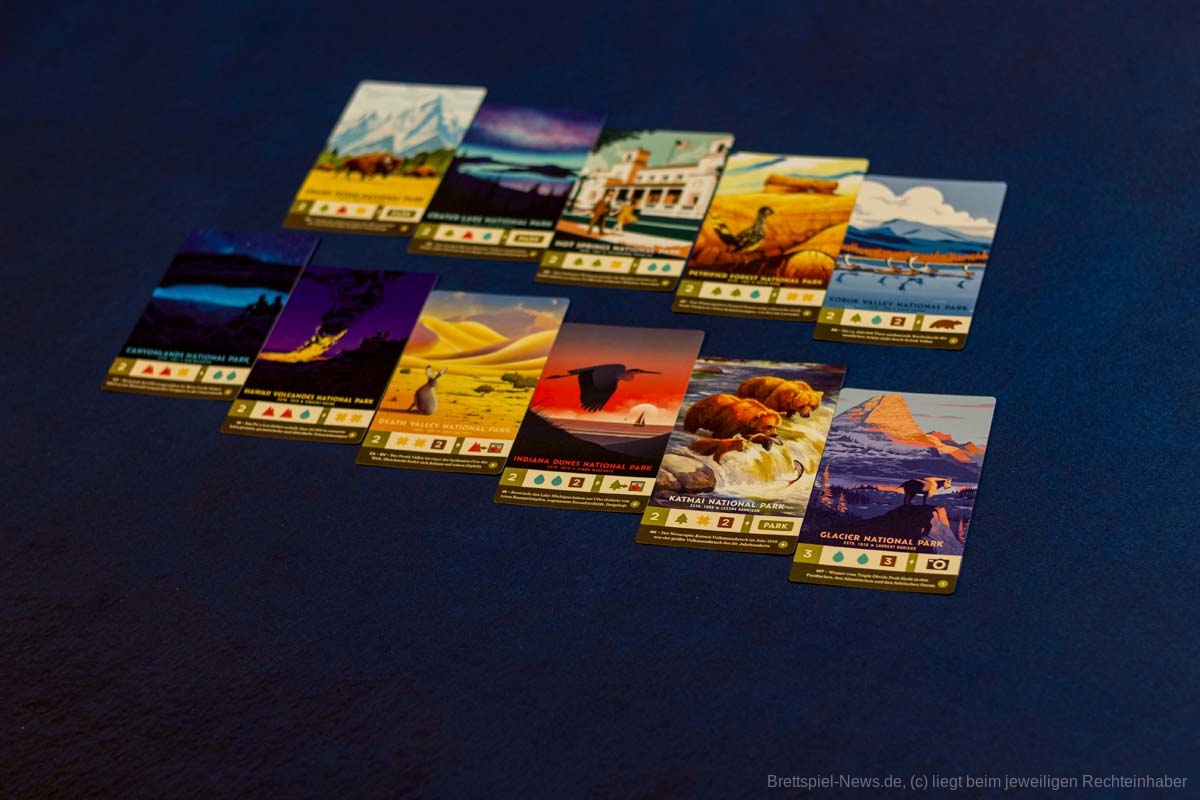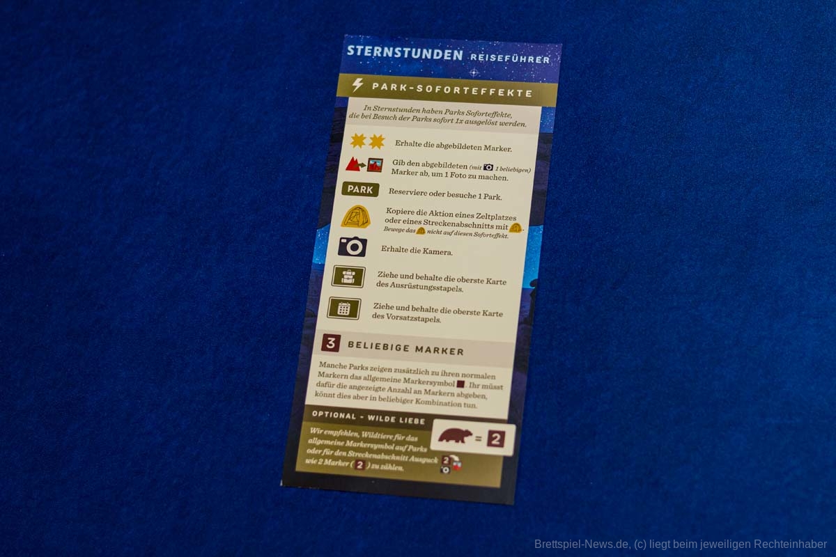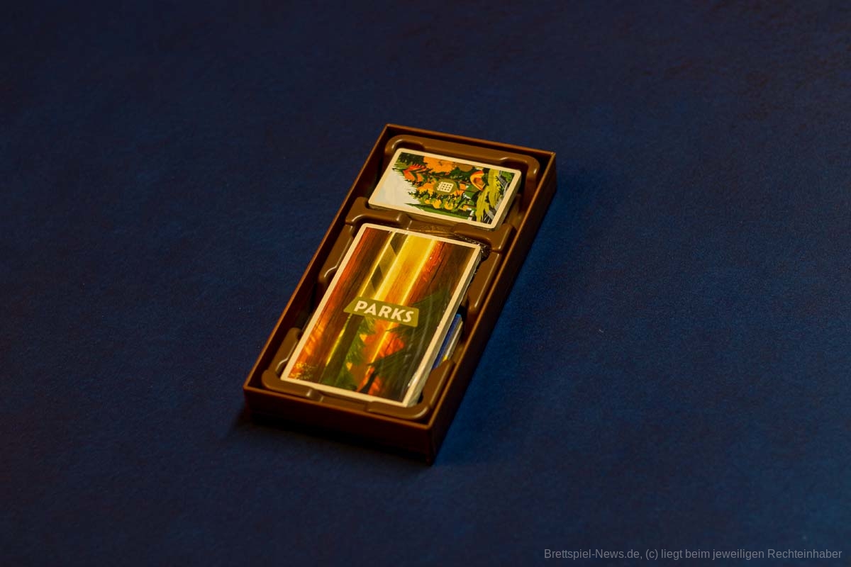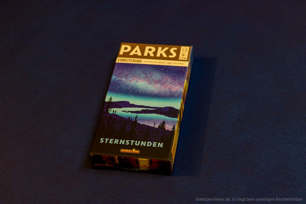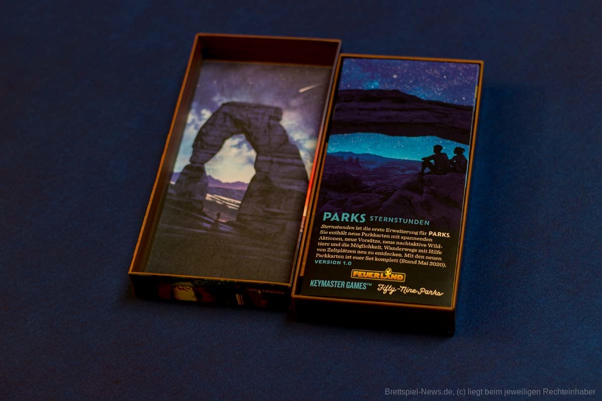 Die Erweiterung STERNSTUNDEN für PARKS von FEUERLAND ist Ende 2020 erschienen. Wir haben nun ein Exemplar und zeigen das Spielmaterial. In der kleinen Box sind 24 zusätzliche Parkkarten von Nationalparks der USA, 26 Vorsatzkarten, vier neue Wildtiere und die Möglichkeit unter freiem Himmel zu zelten enthalten. Die Produktionsqualität ist sehr hochwertig, das Inlay nimmt das Spielmaterial perfekt auf, der UVP liegt bei 19,90 €.