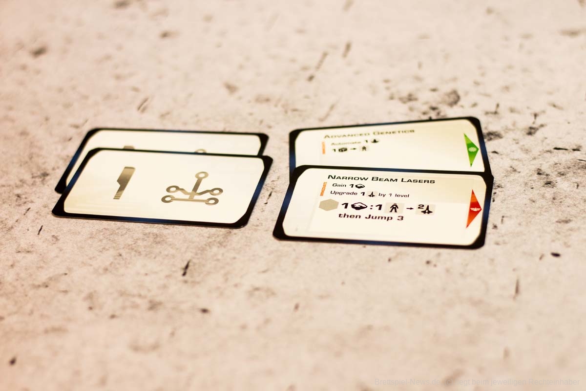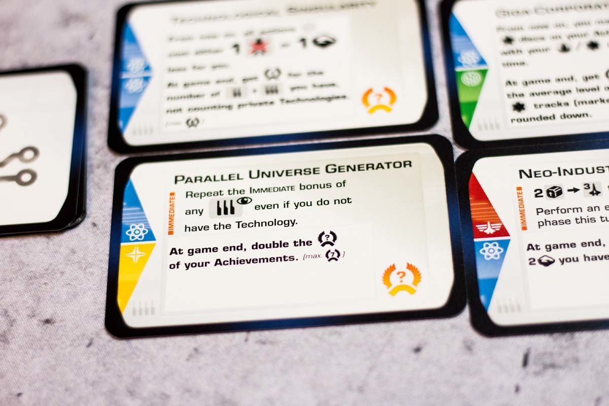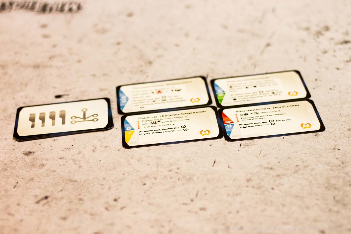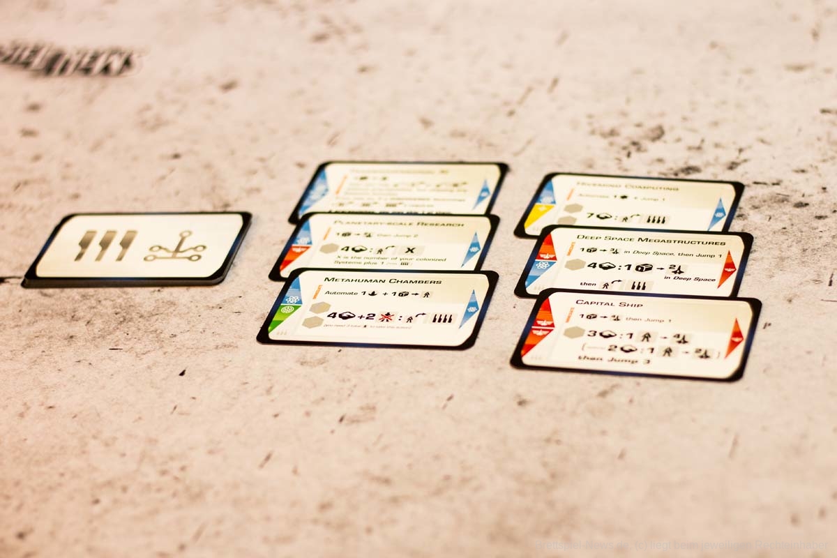 - Innovativer Technologiebaum: Jede entwickelte Technologie fließt in die nächste verfügbare Technologie ein. Dutzende von variablen Technologiekarten sind enthalten, wodurch sich die möglichen technologischen Fortschritte von Spiel zu Spiel unterscheiden.