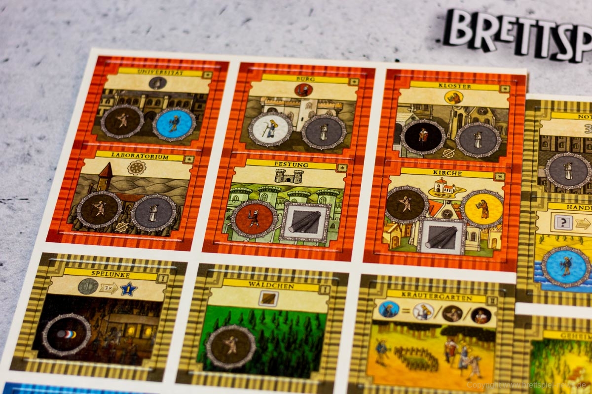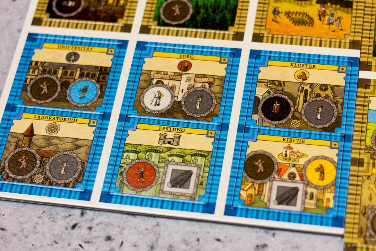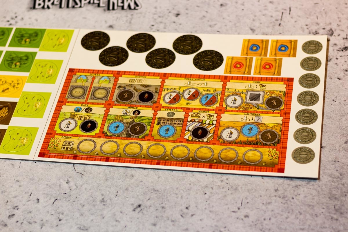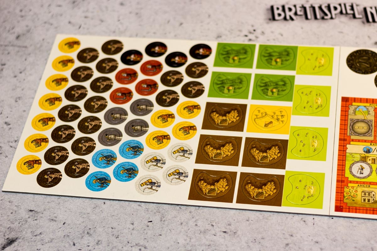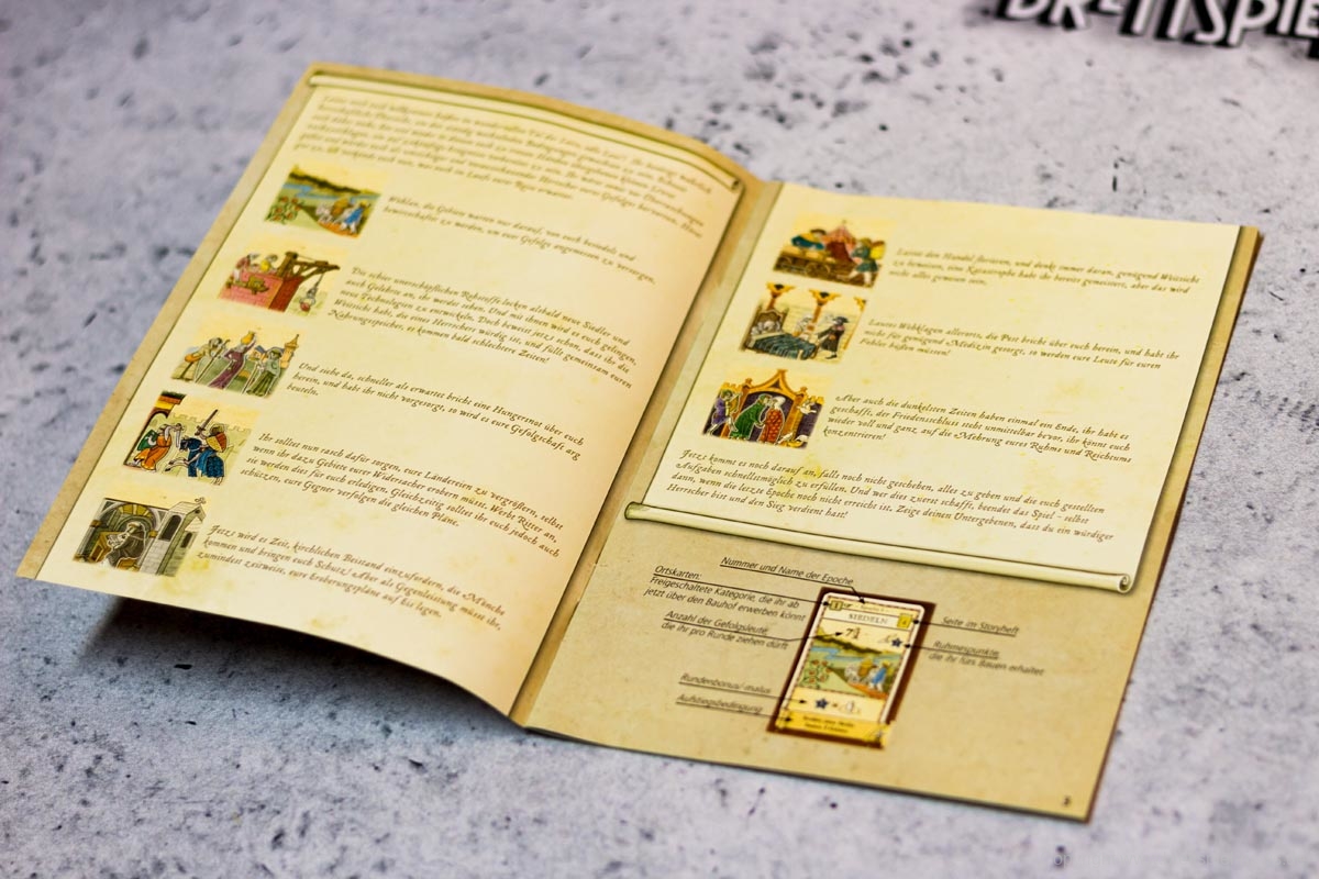 Die Tableaus und die Ortskarten sind aus dicker Pappe und auch Meeples, Festungen und Gebäude wurden aus Holz hochwertig produziert. Das Material in der Grundbox lässt nichts zu wünschen übrig. Die Anleitung beschreibt zunächst die Regeln des Grundablaufs und in den Storyheften finden die Spieler noch einmal den genauen Ablauf mit Hintergrundgeschichten. Nach der ersten Partie haben wir uns endgültig zurechtgefunden, welche Regel in welchem Heft nachzuschlagen ist.