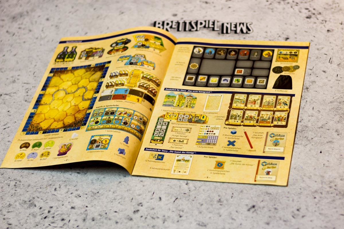 Nicht nur die riesige Box wirkt opulent, auch die Ausstattung kann sich sehen lassen. Im Plastikinlay kann die riesige Menge an unterschiedlichen Pappmarkern gut sortiert werden. Der Spielplan schließt hier wie ein Deckel die untere Ebene ab, sodass auch bei einer Hochkant-Aufbewahrung nichts verrutscht. In der Grundbox liegen für jedes der zwei Stories vier Storyhefte bei, in der Erweiterung wurde nur je ein Heft beigelegt.