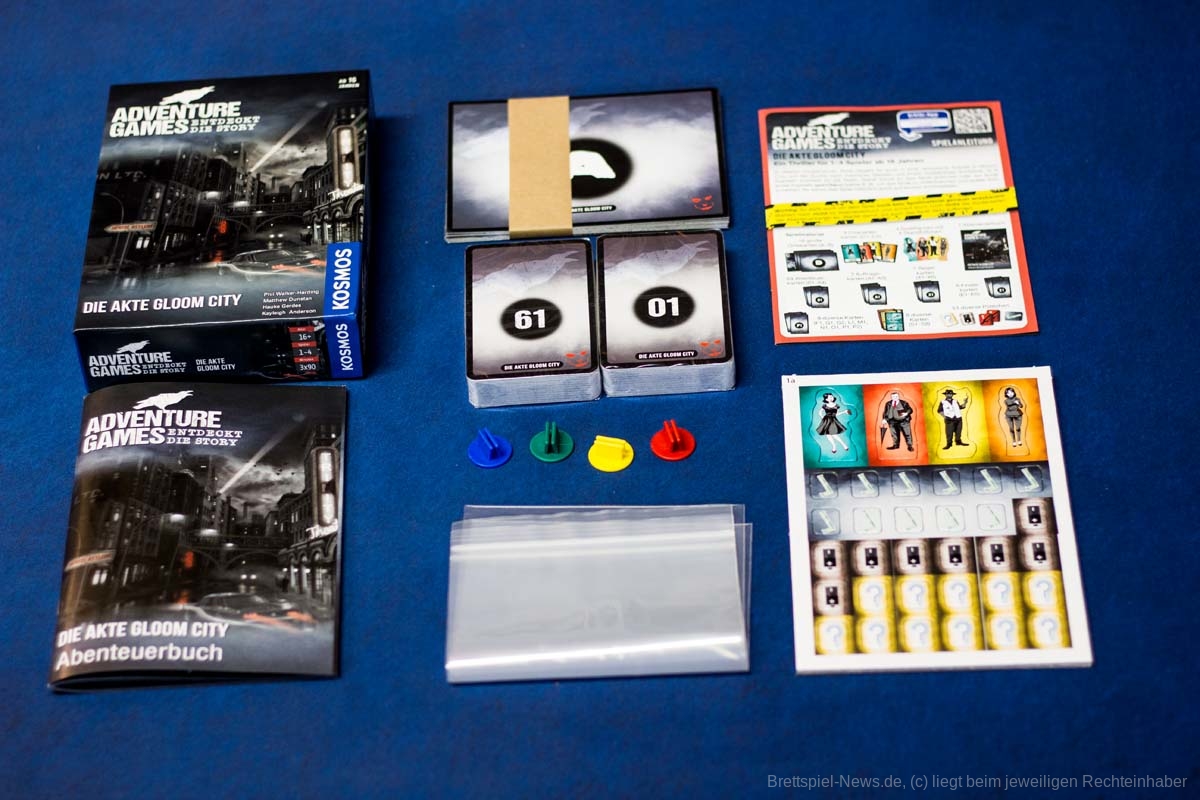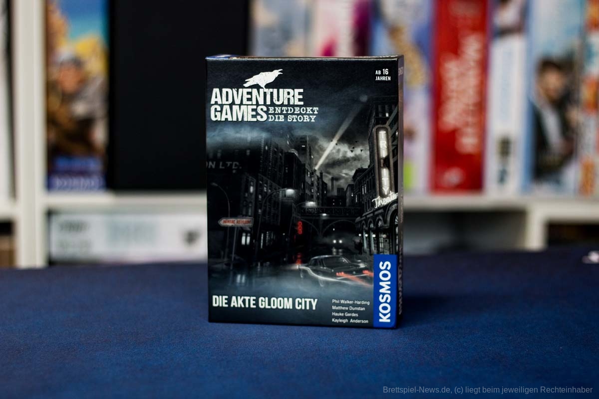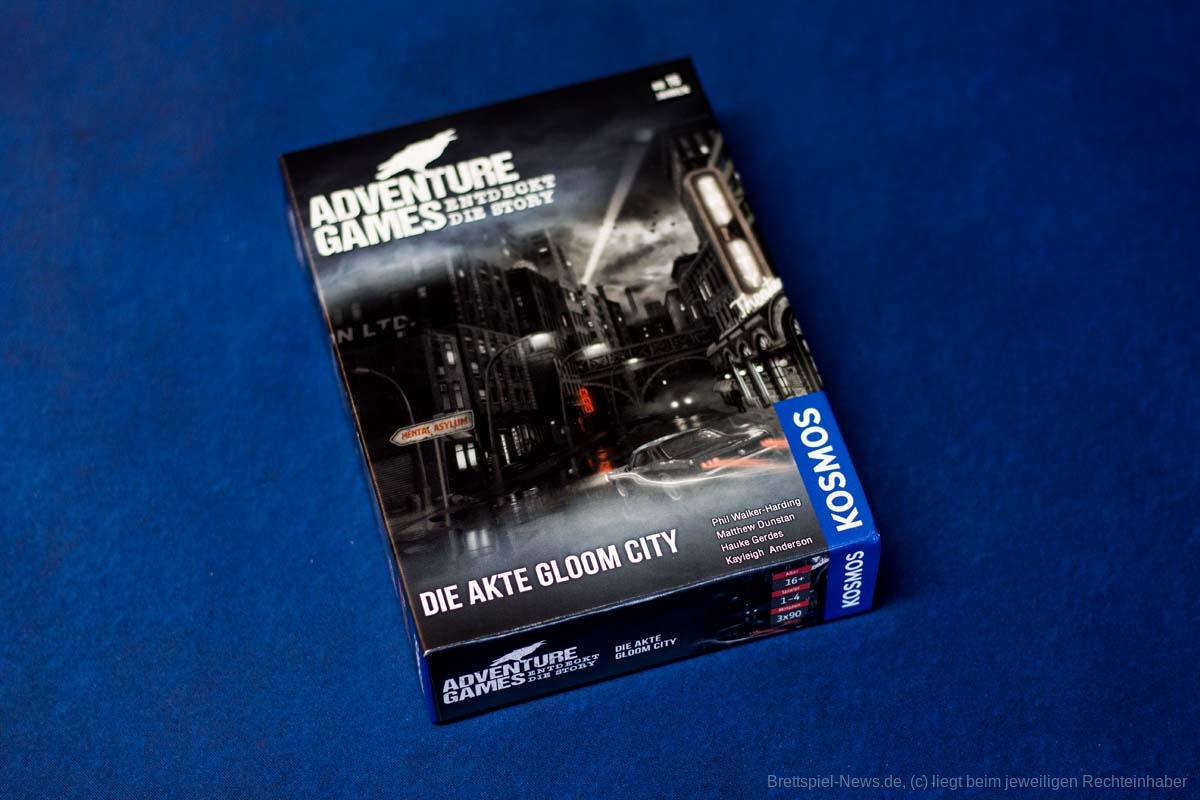 Das neue ADVENTURE GAMES - DIE AKTE GLOOM CITY Spiel von KOSMOS ist mittlerweile erschienen. Für einen UVP von 15 € bietet das kleine Spiel eine Spielzeit von 3x 90 Minuten für 1-4 Erwachsene und Heranwachsende ab 16 Jahren. Dieser Teil wurde von PHIL WALKER-HARDING, MATHEW DUNSTAN, HAUKE GERDES und KAYLEIGH ANDERSON kreiert. Die Spielbox ist gut gefüllt mit Spielmaterial und optional bietet das Spiel eine APP, in der die Texte vorgelesen werden.