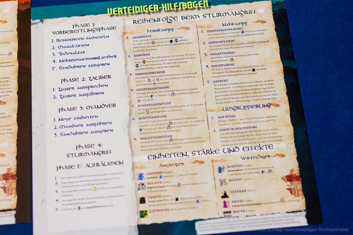 Angreifer und Verteidiger beginnen jede Runde damit, Vorräte anzulegen und Vorbereitungen zu treffen. Der angreifende Nekromant wirkt seine dunkle Magie mithilfe von mächtigen Zauberkarten. Doch jeder seiner Zauber gibt dem Verteidiger mehr Zeit, eigene Vorbereitungen zu treffen. Der Verteidiger erhält Sanduhren, die er für verschiedene Aktionen innerhalb der Festung oder zur Verteidigung vor den Angriffen der Belagerungswaffen und der Untoten auf die Burgmauern einsetzen kann. Nach den Manövern des Angreifers und dem Sturmangriff mit Fern- und Nahkämpfen sowie der Umgruppierung der Verteidiger endet eine Runde. Sollte es dem Angreifer gelungen sein, die Verteidigungslinie an wenigstens einem Mauerabschnitt zu durchbrechen, gelangt er ins Innere der Festung und erobert die Reliquie. Halten die Mauern dem Andrang stand, beginnt eine neue Runde.