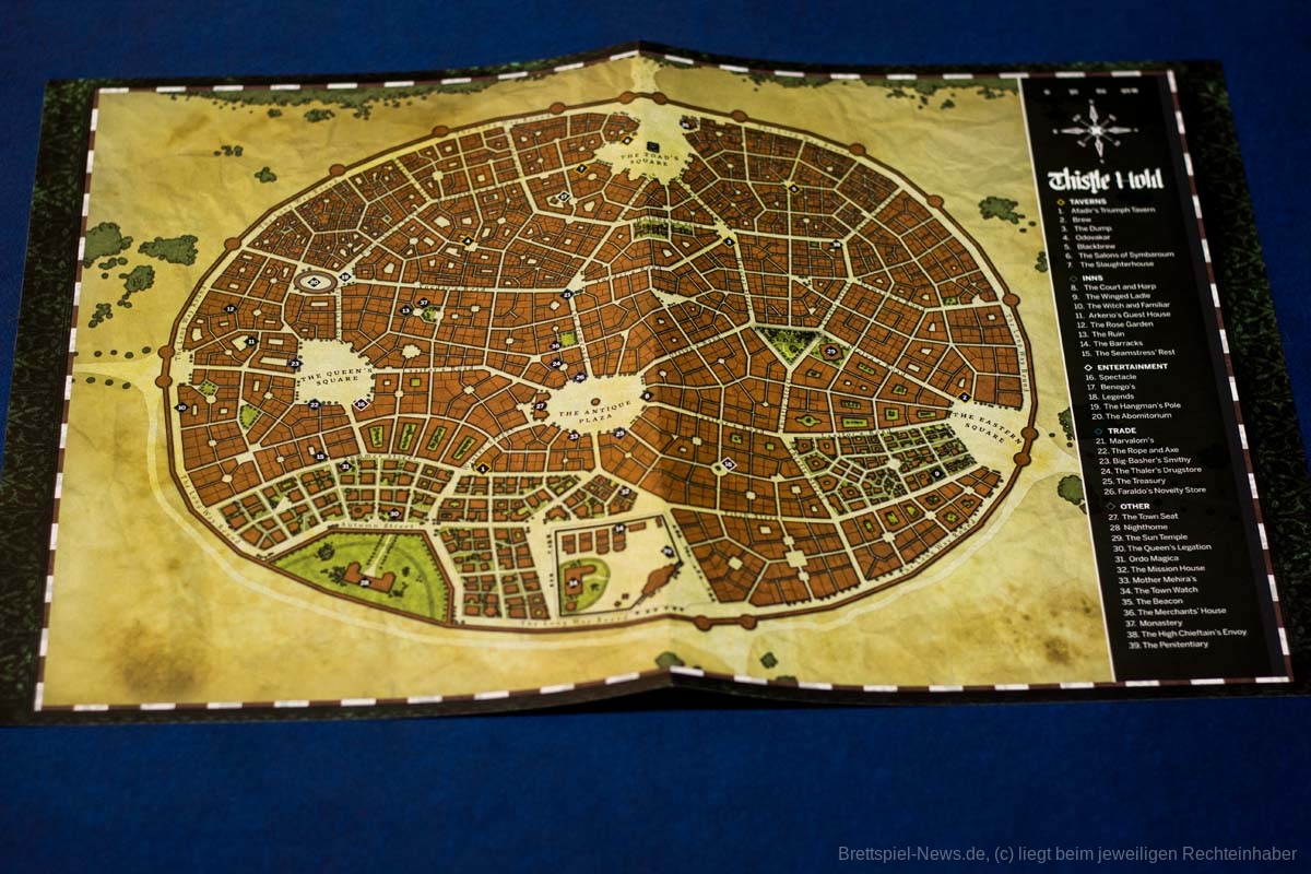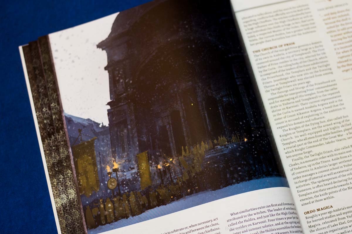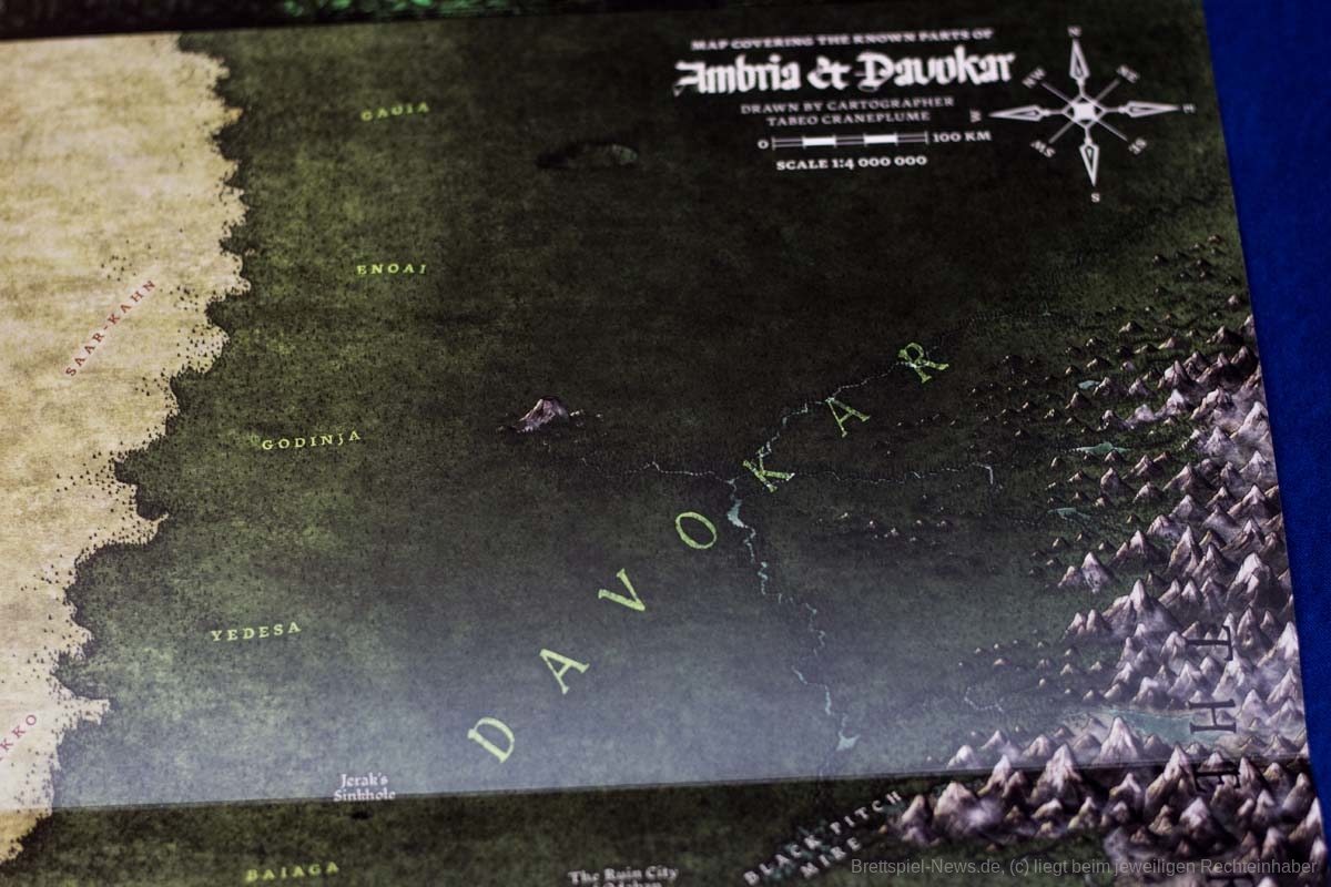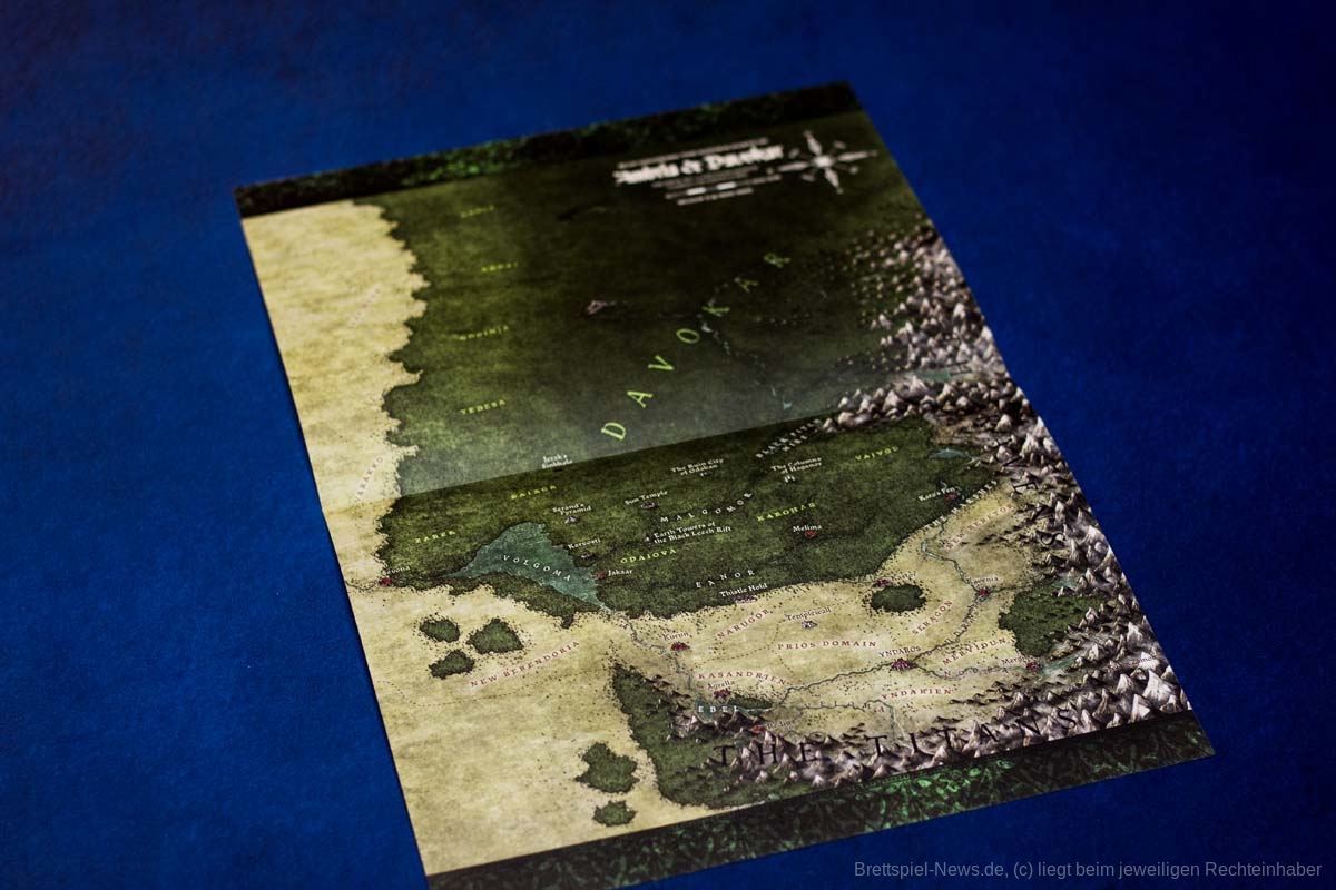 - Mehr als 50 Seiten, die die Geschichte, die Geographie und die Kulturen der Spielwelt beschreiben und sich dabei auf vier besondere Schauplätze konzentrieren: den Wald von Davokar, die Glücksjägerstadt Thistle Hold, die ambrische Hauptstadt Yndaros und die Klippe von Karvosti, wo sich die Barbarenclans treffen.