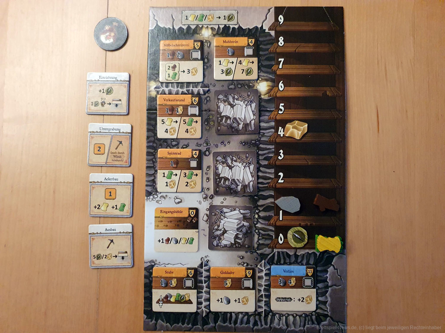 Zu Beginn des Spiels steht ihr vor einem Berg. Eine kleine Aushöhlung erklärt ihr zum Eingangsbereich für die zukünftige Behausung eurer Sippschaft, die bei Spielbeginn aus gerade einmal zwei arbeitsfähigen Zwergen besteht. Am Ende des Spiels werdet ihr vier haben. Höhlt eure Höhle aus. Richtet die Hohlräume ein. Sammelt Körner, Fasern und Baumaterialien und ihr werdet es zu einem Wohlstand ungeahnten Ausmaßes bringen für die Zeit um 5000 v. Chr. jedenfalls und in einer Landschaft, die so lebensunwirklich ist, dass ihr die feuchte Kälte einer Höhle der sengenden Hitze vorzieht. Man ahnt: Auch Wohlstand ist relativ.